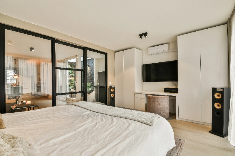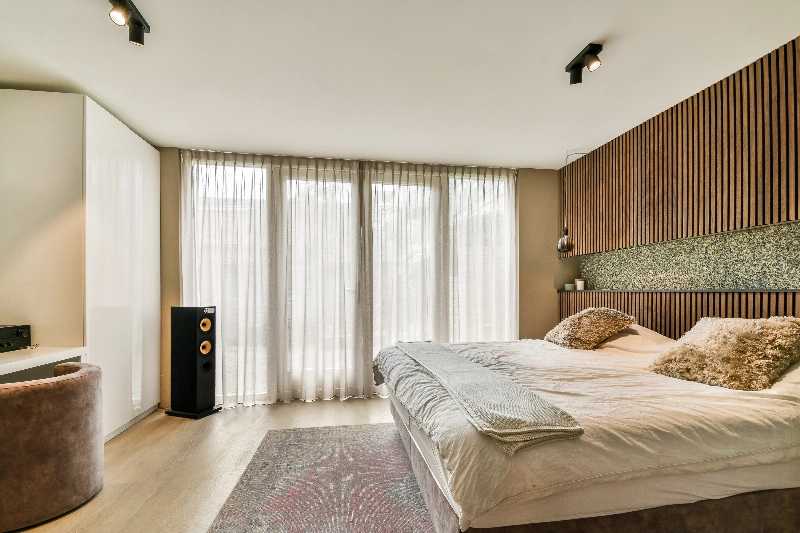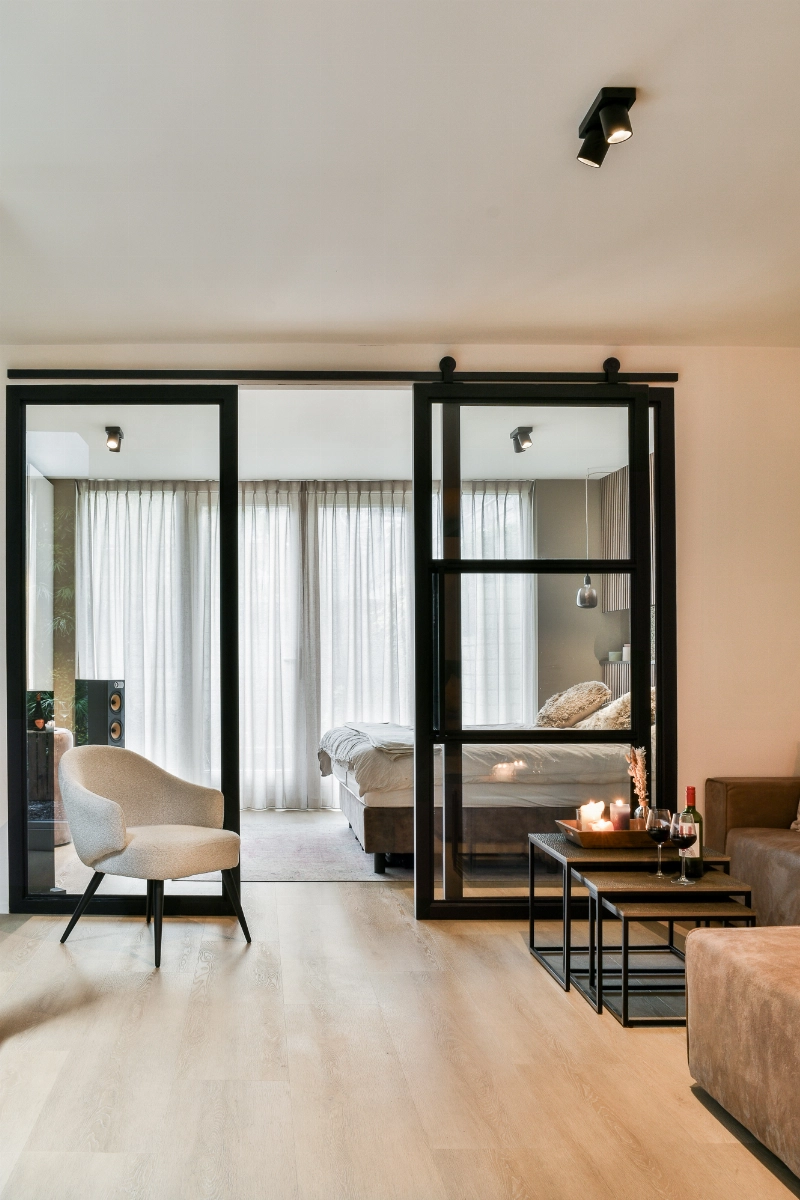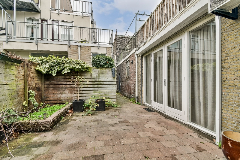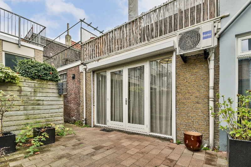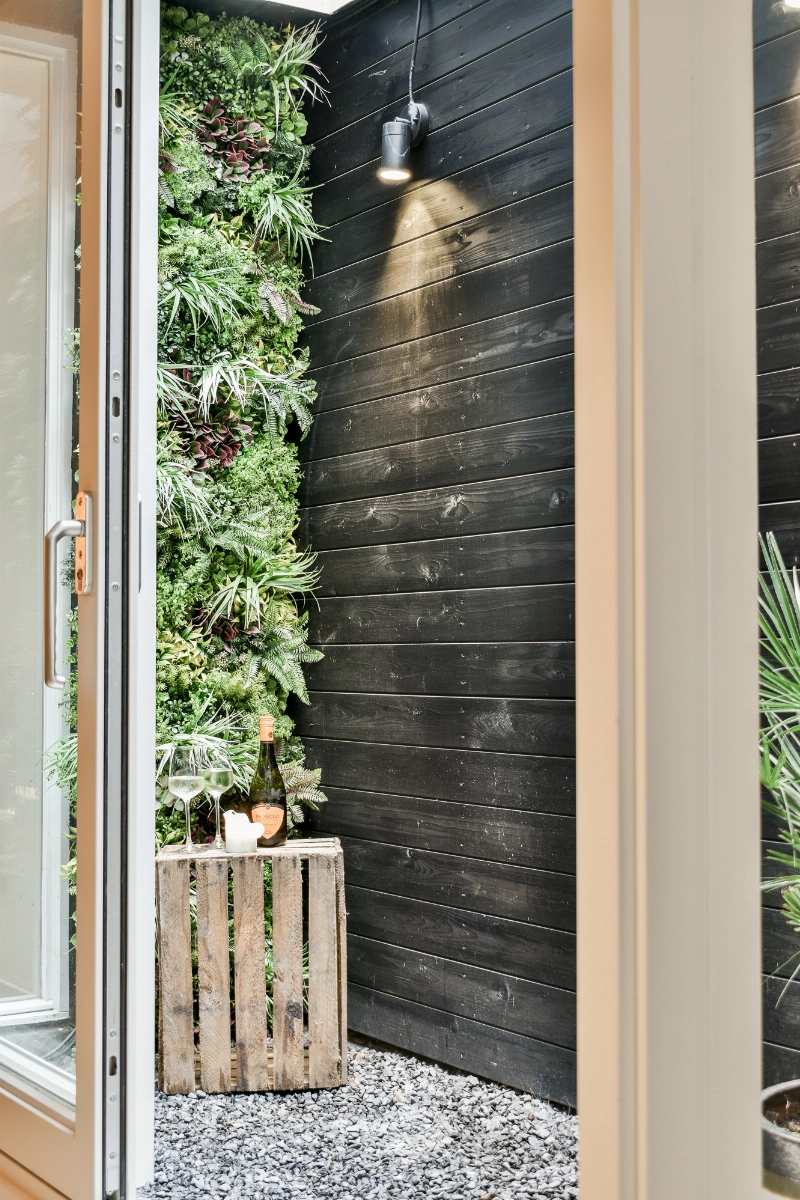 De royale slaapkamer bereik je via een stoere zwarte stalen pui. Hier is aan alles gedacht: een sfeervolle lattenwand achter het bed, airconditioning voor comfort in de zomer, en een rolluik om heerlijk donker te kunnen slapen. Via de slaapkamer kom je op een achterpad, handig om via de achterzijde de woning te verlaten.