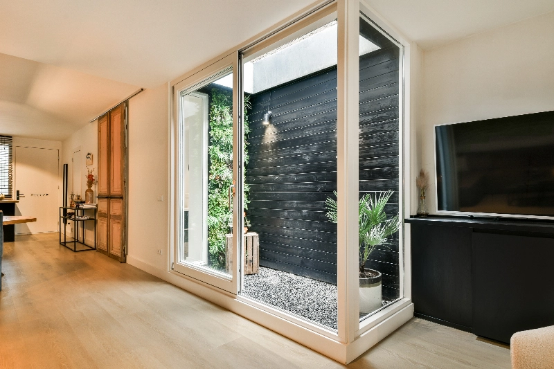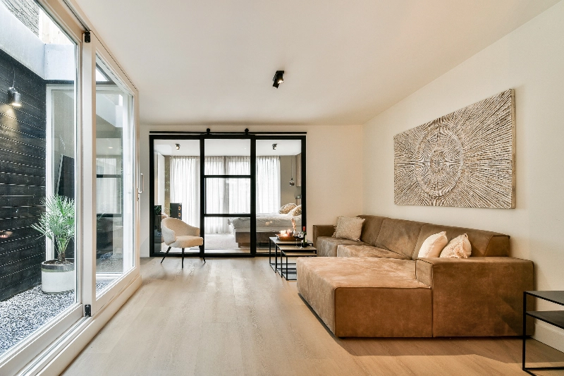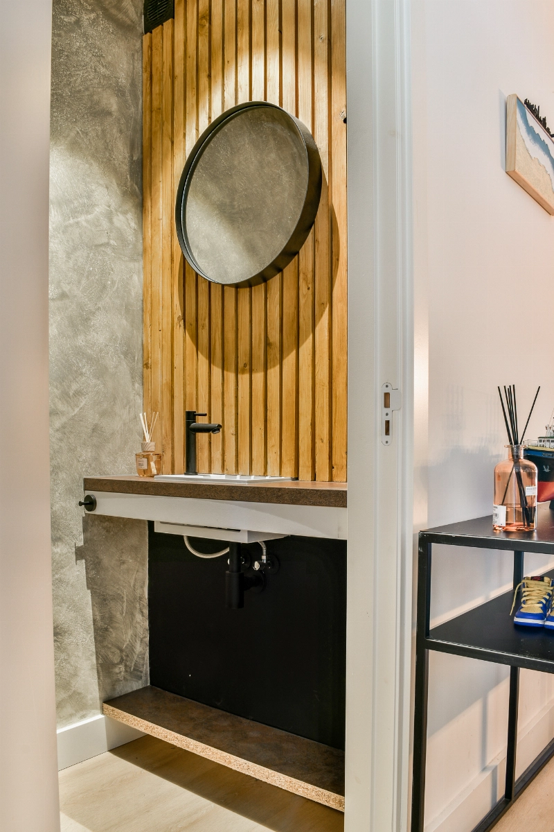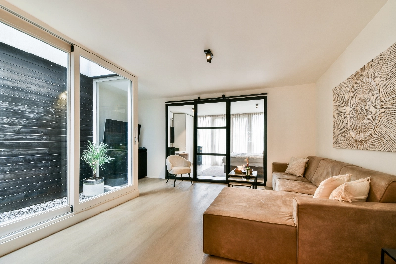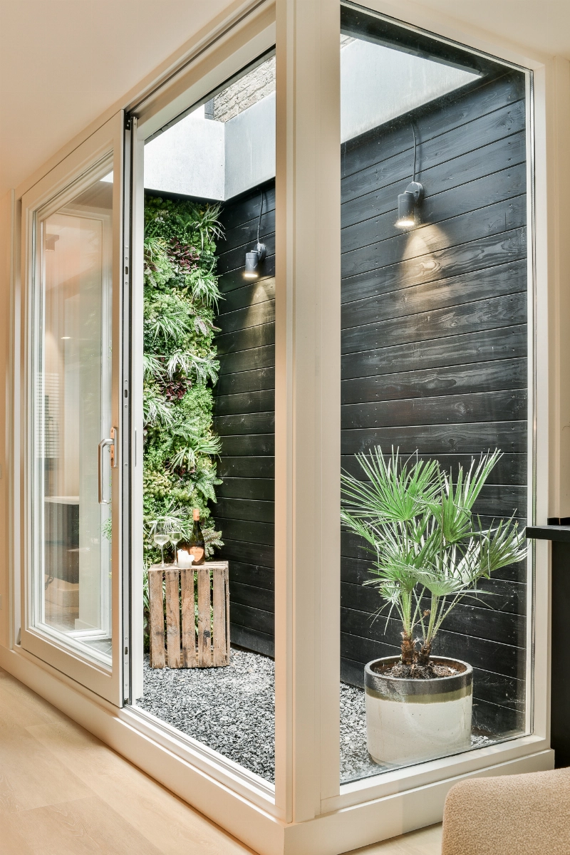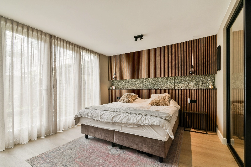 De royale slaapkamer bereik je via een stoere zwarte stalen pui. Hier is aan alles gedacht: een sfeervolle lattenwand achter het bed, airconditioning voor comfort in de zomer, en een rolluik om heerlijk donker te kunnen slapen. Via de slaapkamer kom je op een achterpad, handig om via de achterzijde de woning te verlaten.