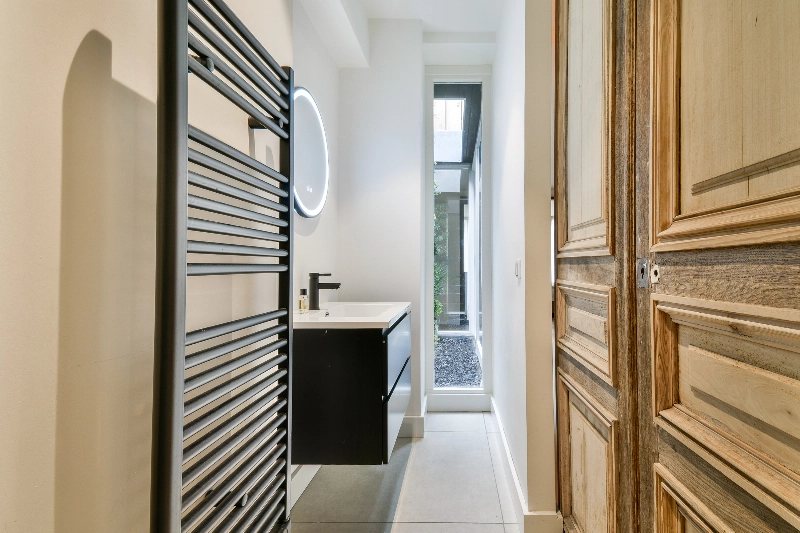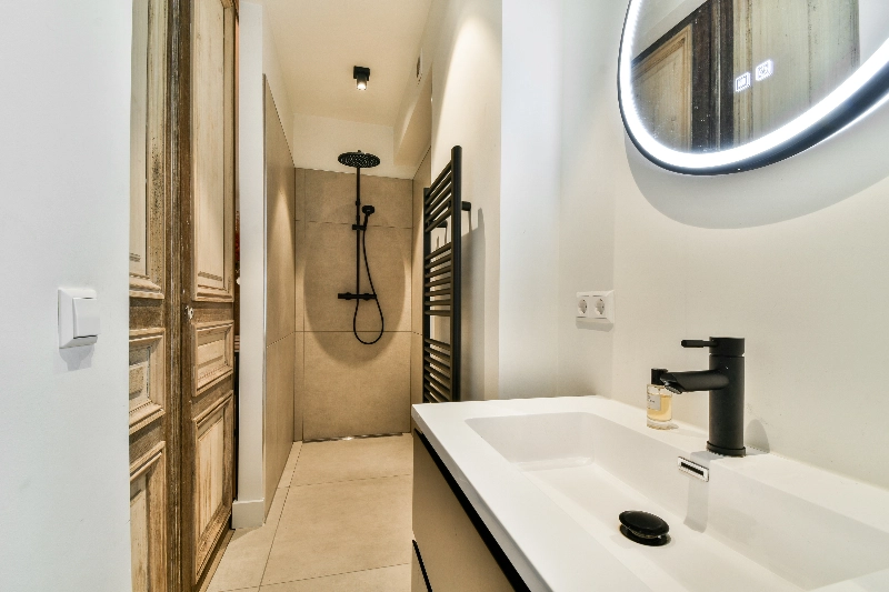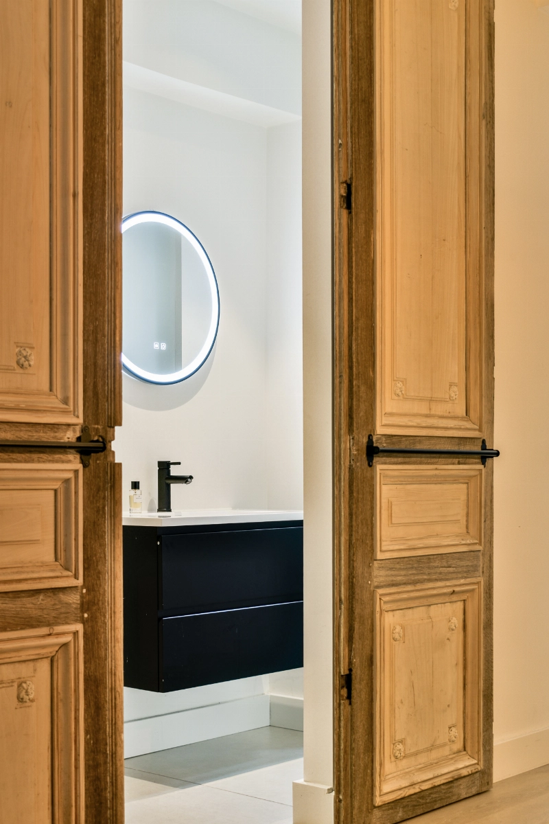 Via elegante Frans eiken deuren bereik je de moderne badkamer. De combinatie van zandkleurige tegels, strak stucwerk, een ruime inloopdouche met regendouche, een handdoekradiator en een stijlvol wastafelmeubel met ronde verlichte spiegel geven deze ruimte een luxe uitstraling.