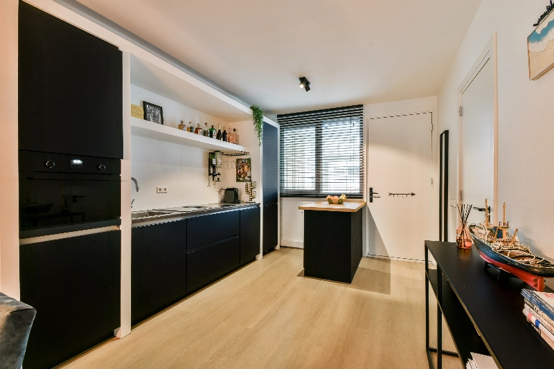 De voordeur leidt je direct naar de stijlvolle zwarte keuken met een betonlook aanrechtblad. Deze moderne keuken is voorzien van diverse inbouwapparatuur waaronder een inductiekookplaat met afzuiging, een koelkast, een vaatwasser en een combioven. De leuke bar biedt ruimte voor de wasmachine en een handige opbergkast.