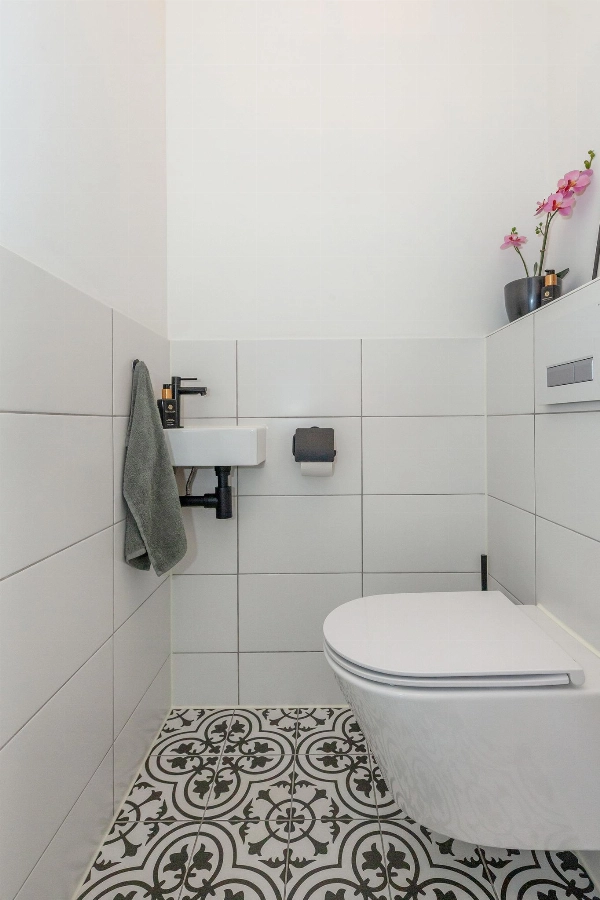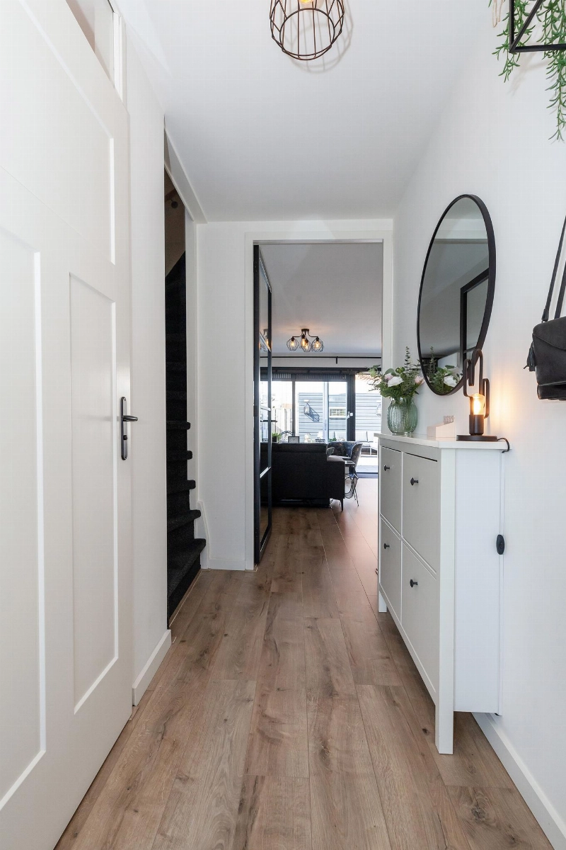 Via de verzorgde voortuin bereik je de voordeur. Entree, gang met uitgebreide meterkast en een gedeeltelijk betegelde toiletruimte met zwevend toilet met luchtfilter en een soft-close toiletbril. De strakke laminaatvloer loopt door naar de woonkamer en keuken.