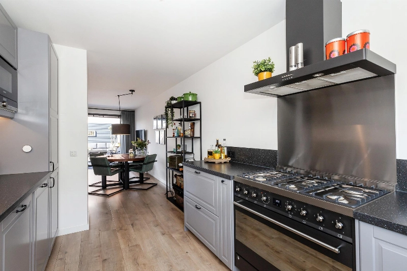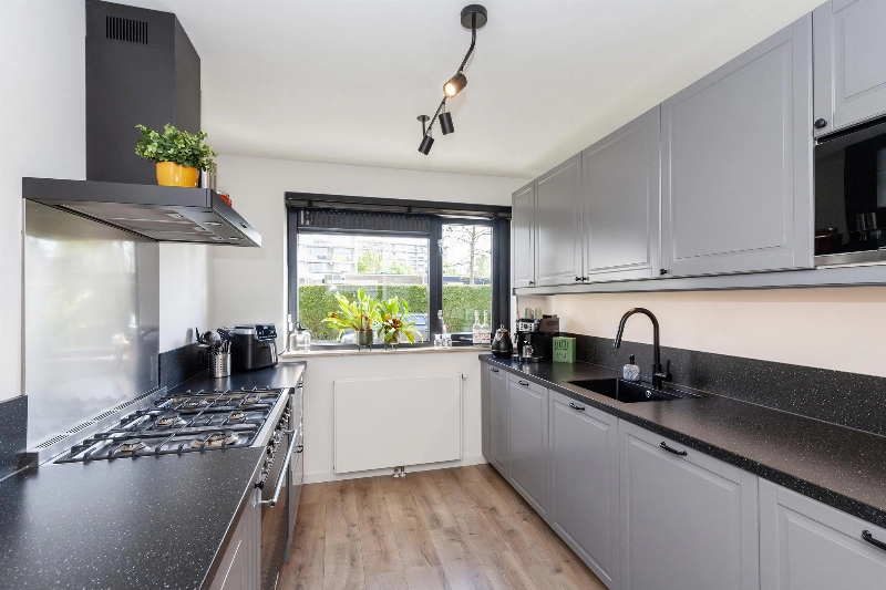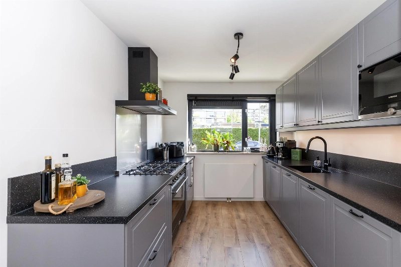 We gaan weer naar binnen en komen in de keuken aan de voorzijde van de woning. Deze keuken is in 2019 nieuw geplaatst en is een plaatje…! De warm grijze opstelling vind je terug aan beide zijden en is afgewerkt met een kunststof werkblad met hoge spatrand. De lage opstelling is voorzien van een 6-pits Smeg-fornuis met brede oven, een afzuigkap en brede lades. De andere