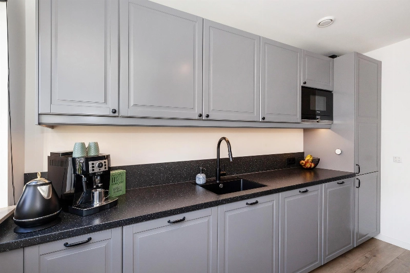 (hoge) zijde is voorzien van een zwarte spoelbak, veel kastruimte en de koelkast en vriezer.