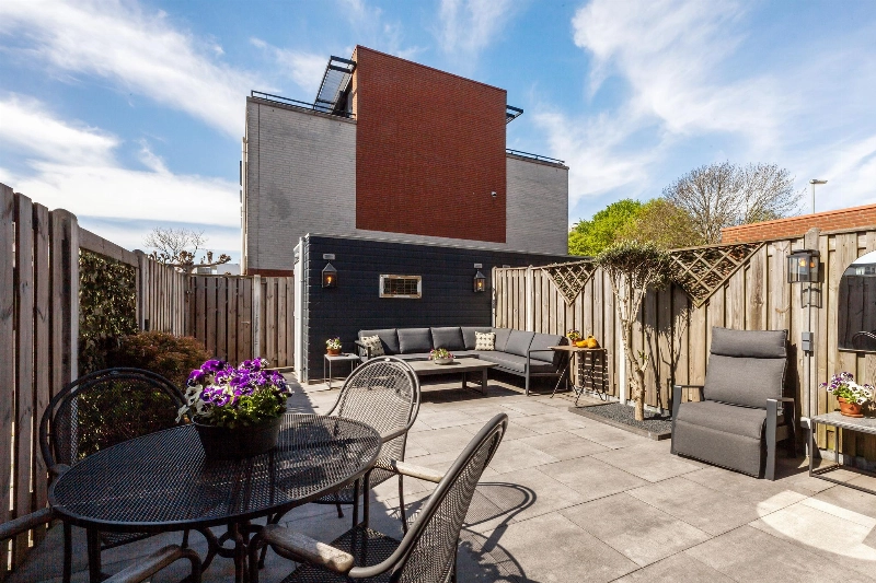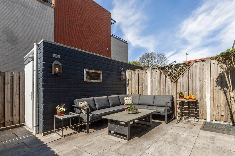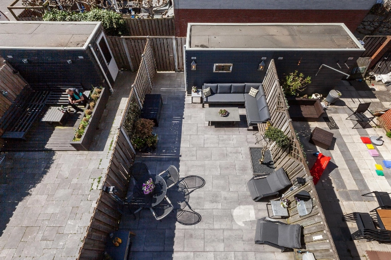 Via de staallook tussendeur bereik je de woonkamer. Deze is voorzien van een airco en heeft een goede afmeting met meer dan genoeg ruimte voor een goede zithoek en grote eettafel. De dubbele deur geeft toegang tot de fraai aangelegde achtertuin. Deze is voorzien van strakke betegeling en schuttingen, een houten berging met elektra, een zonnescherm, een waterkraan en er is een achterom naar de brede steeg. Deze tuin is zeer zonnig gelegen op het zuidwesten en hier kan je al vroeg in het jaar genieten van de eerste zonnestralen!
