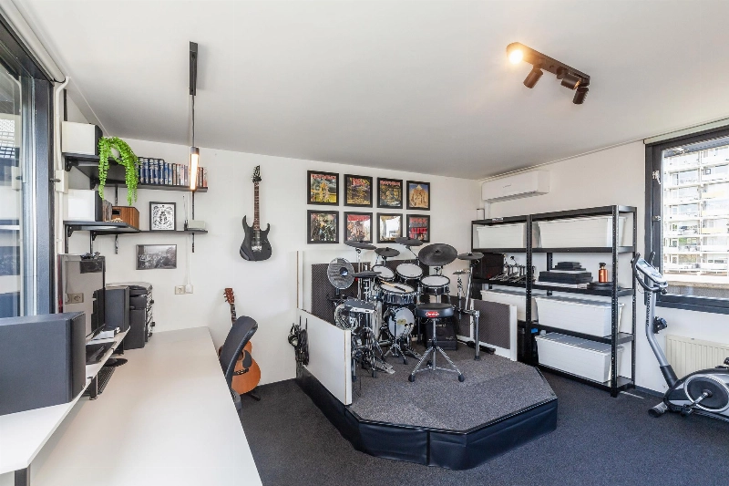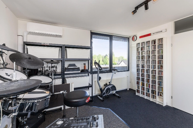Deze verdieping is thans een open ruimte voorzien van een airco en ook hier weer elektrische rolluiken. Er is een vaste kast met opstelplaats voor de MV en er is een grote schuifkastenwand met daarachter de opstelplaats voor de CV, wasmachine, droger en de omvormer voor de zonnepanelen.