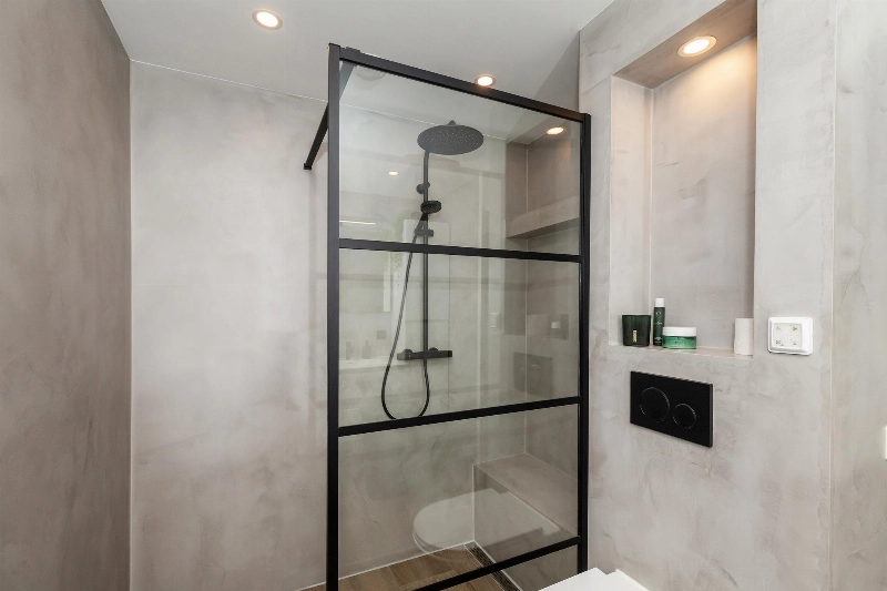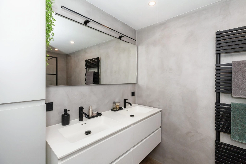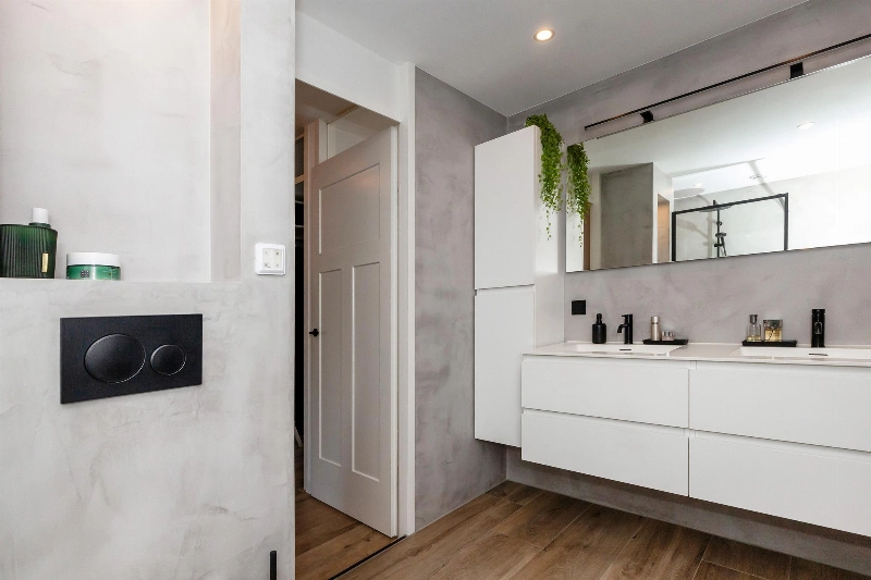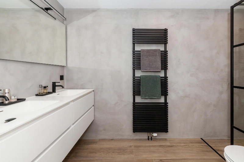 En dan de badkamer… ook alweer kant en klaar! Deze is in 2019 vernieuwd en voorzien van betonciré wanden en keramische houten vloertegels. Verder is er een breed wastafelmeubel met dubbele kraan, een handdoekenradiator, 2e toilet en een grote inloopdouche met zitje en nisje.