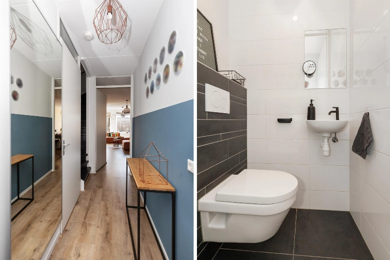 Voortuin met moderne bestrating. Entree, hal met meterkast(8 groepen, 3x aardlekschakelaar en hoofdschakelaar) en een keurige toiletruimte met wit/zwarte betegeling, een zwevend toilet en een fonteintje.