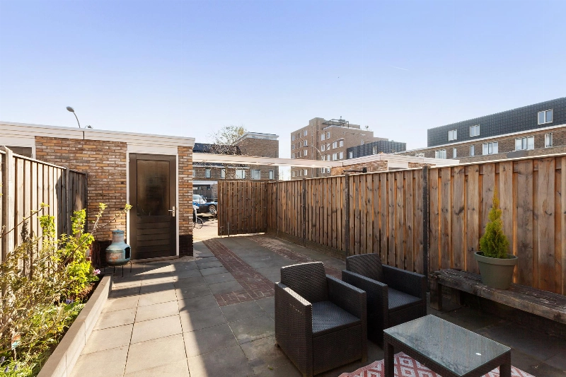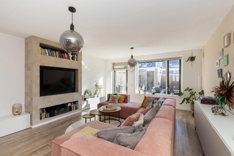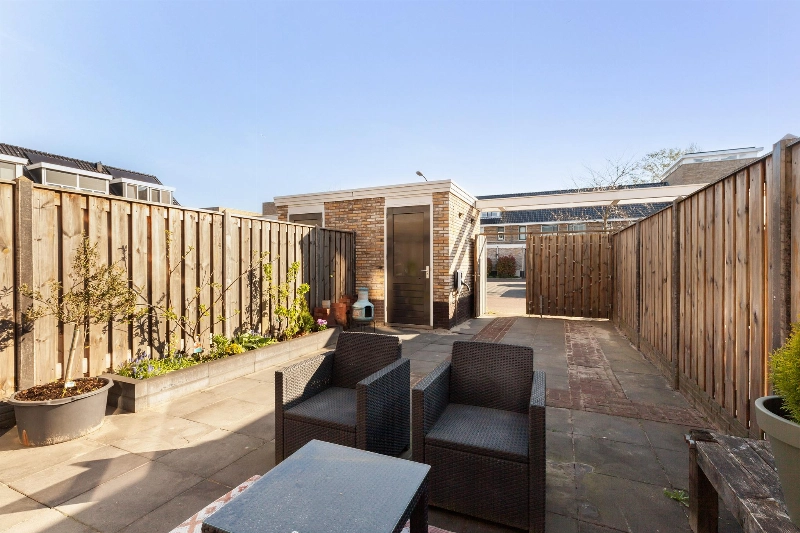De royale uitgebouwde woonkamer is voorzien van een sfeervolle houtlook laminaatvloer met vloerverwarming, glad gestucte wanden en een moderne cinemawall. Via de achterdeur bereikt u de verzorgde tuin op het noordoosten. De tuin is aangelegd met grijze grote tegels en klinkerbestrating, heeft een groen border en een gemetselde berging (met elektra). De achterzijde van de schutting kan worden geopend, zodat u uw auto op eigen terrein kan parkeren.