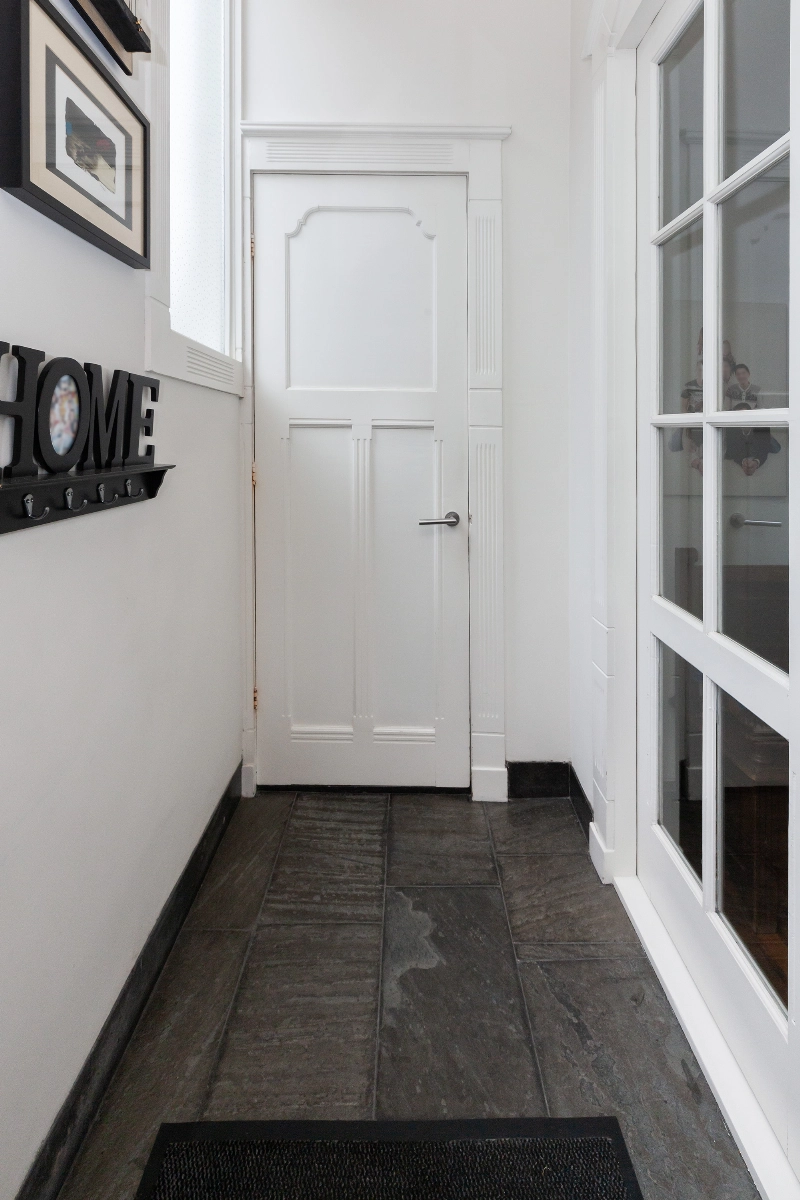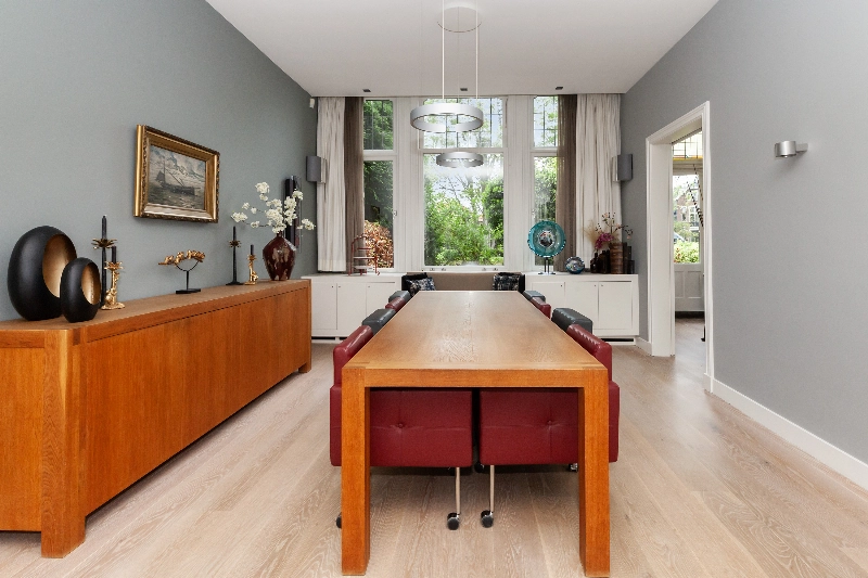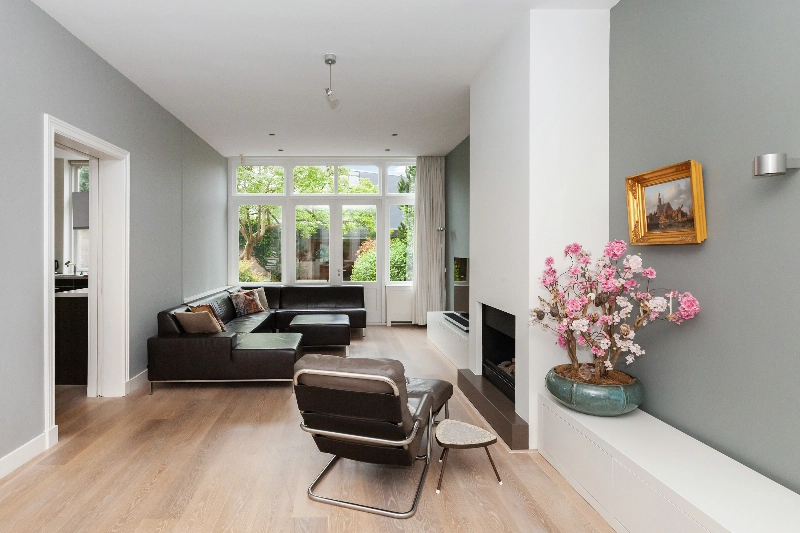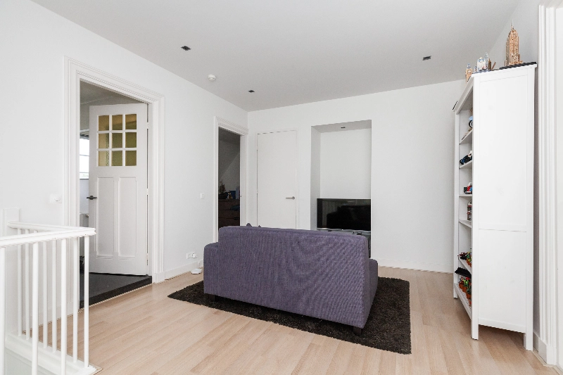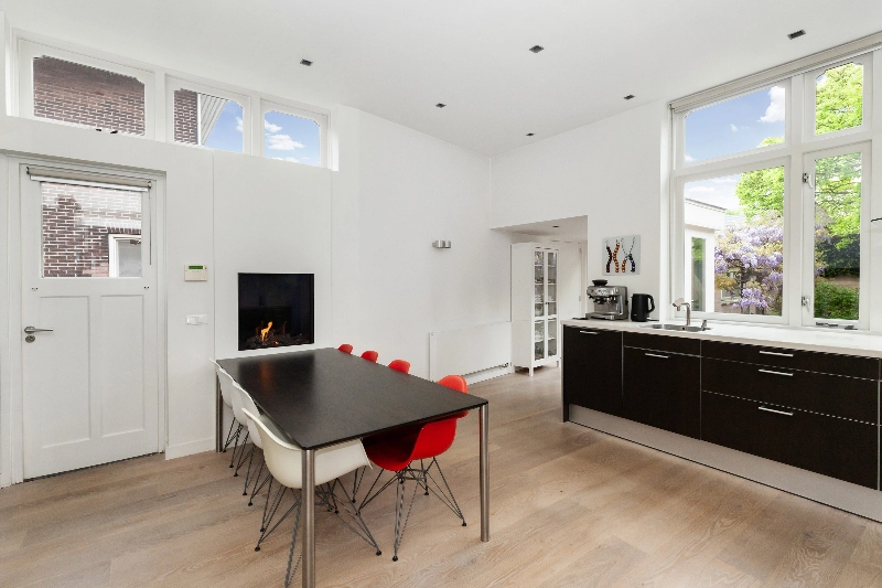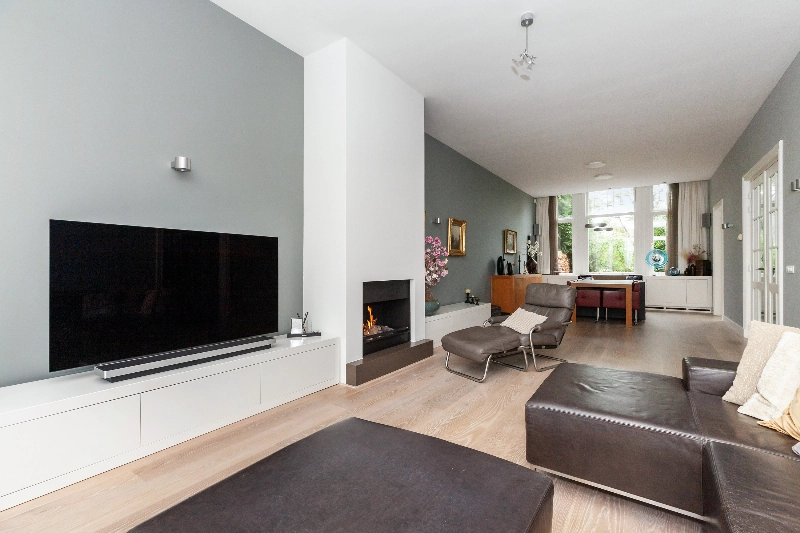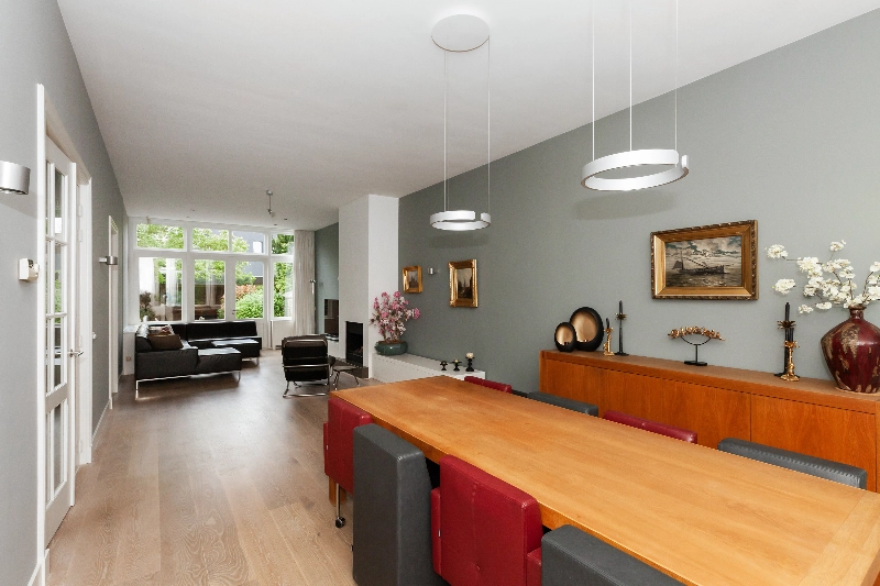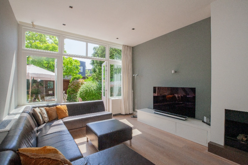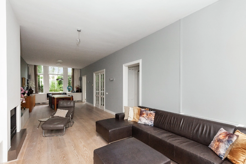 De centrale hal geeft toegang tot bijna alle vertrekken op de begane en is voorzien van de originele parketvloer, een garderobekast en wanneer u doorloopt leiden de twee openslaande deuren u naar de living. Wat een mooie ruimte! Licht, hoogte en sfeer...het is hier allemaal! De woonkamer is voorzien van een eiken parketvloer, gestucte wanden en de gashaard met composiet omlijsting maakt het geheel af. De dubbele deuren geven toegang tot de achtertuin.