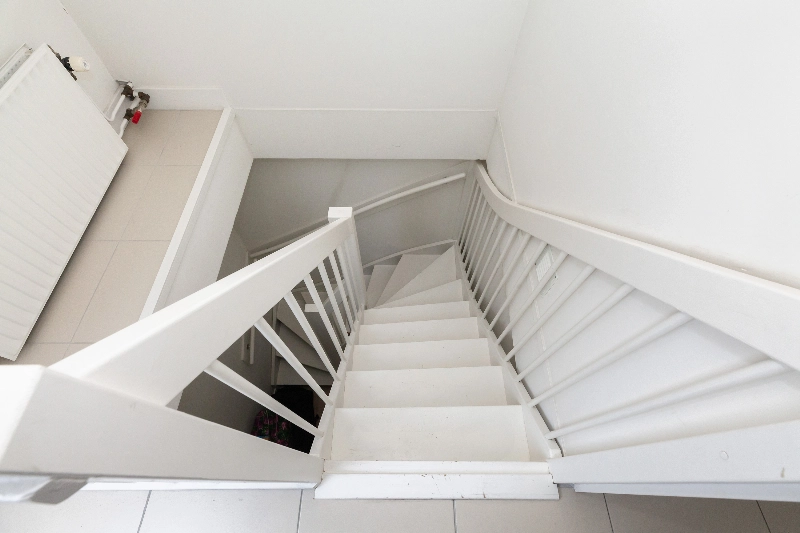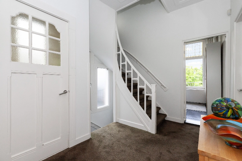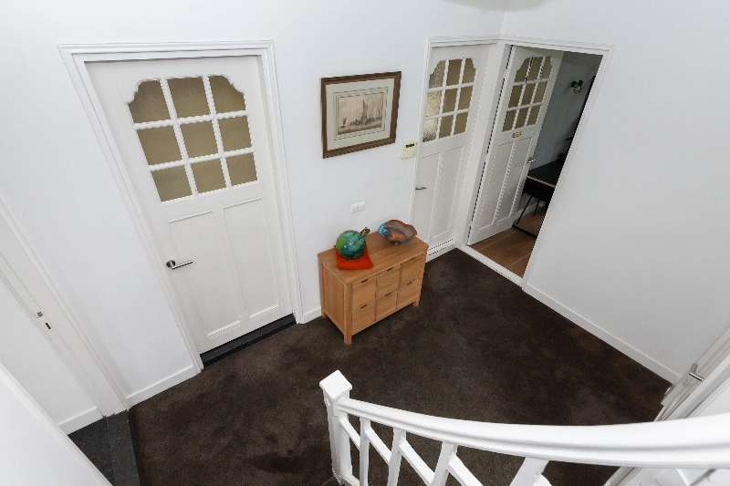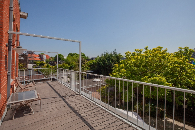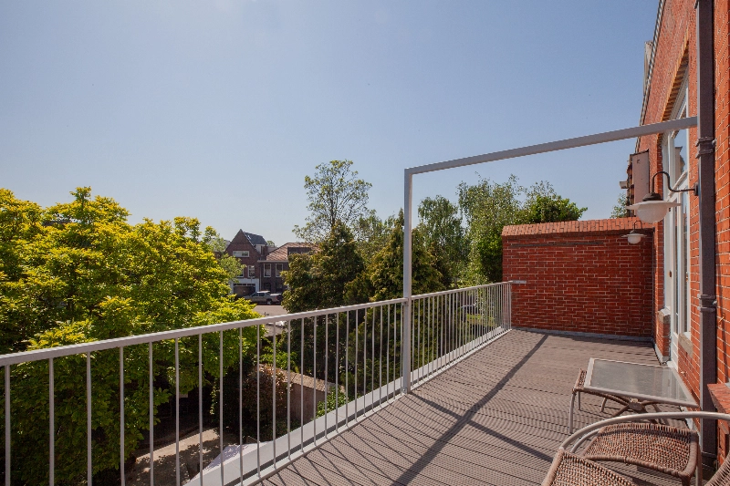 We gaan weer naar binnen en betreden de trap naar de 1e verdieping. Op het bordes treft u een deur naar het zijbalkon van de woning.
