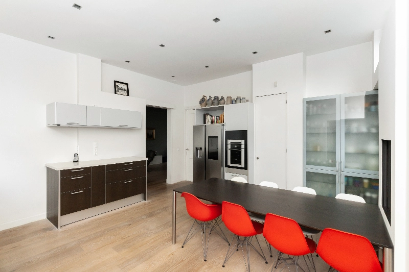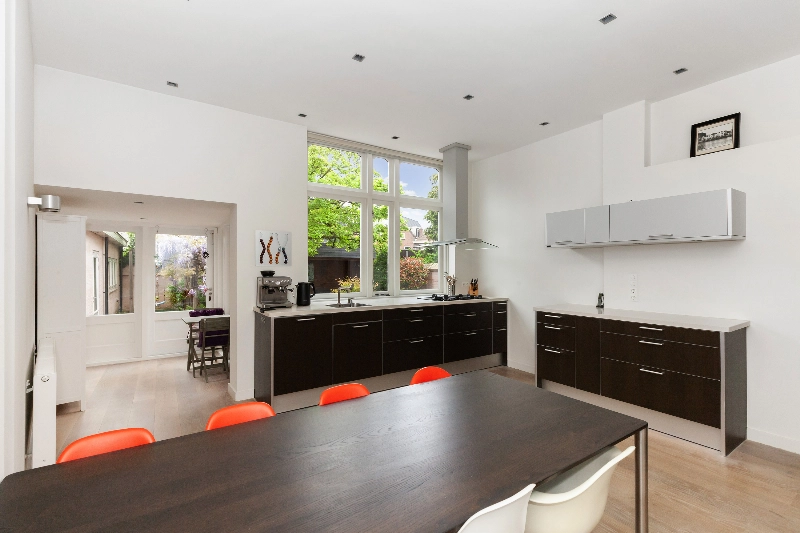 We gaan weer naar de achterzijde van de woonkamer en lopen door naar de keuken. Deze ruimte is in 2007 uitgebouwd waardoor een prachtige woonkeuken is ontstaan. De Bulthaup opstelling met licht composiet werkblad en notenhoutfineer fronten met RVS afwerking heeft alle gewenste apparatuur zoals; vaatwasser, afzuigkap, 5 pits gaskookplaat, magnetron en oven. Dit alles is met aandacht opgesteld in diverse opstellingen, samen zorgen zij voor veel werk- en opbergruimte.