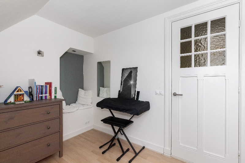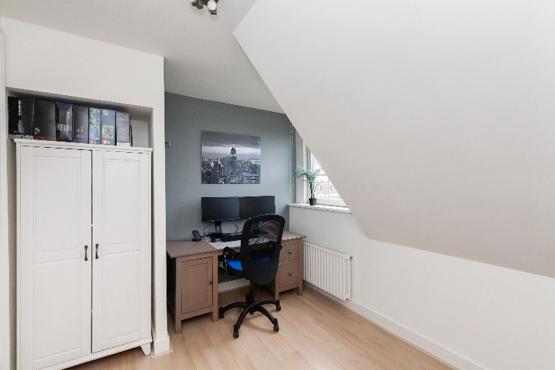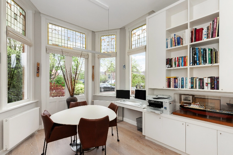 Aan de voorzijde van de woonkamer én via de centrale hal is de werkkamer aan de voorzijde te bereiken. Deze heerlijke werkplek kenmerkt zich door de 4 prachtige glas-in-loodramen en er is een kast gemaakt in hoekopstelling.