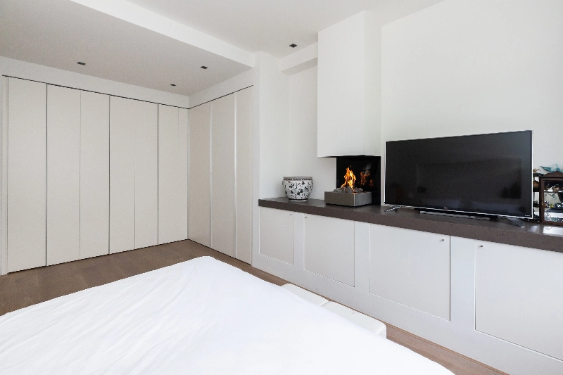 Slaapkamer II is eveneens gelegen aan de voorzijde. Deze heerlijk ruime ouderslaapkamer is voorzien van een grote hoekkast, een gashaard met composietblad, kasten en deur naar de naastgelegen badkamer. Ook hier is het glas-in-loodwerk tussen het dubbel glas verwerkt.