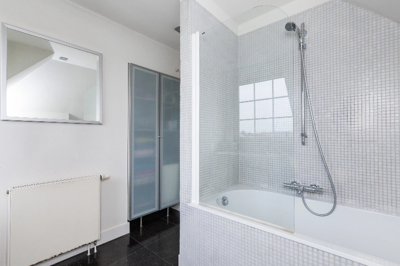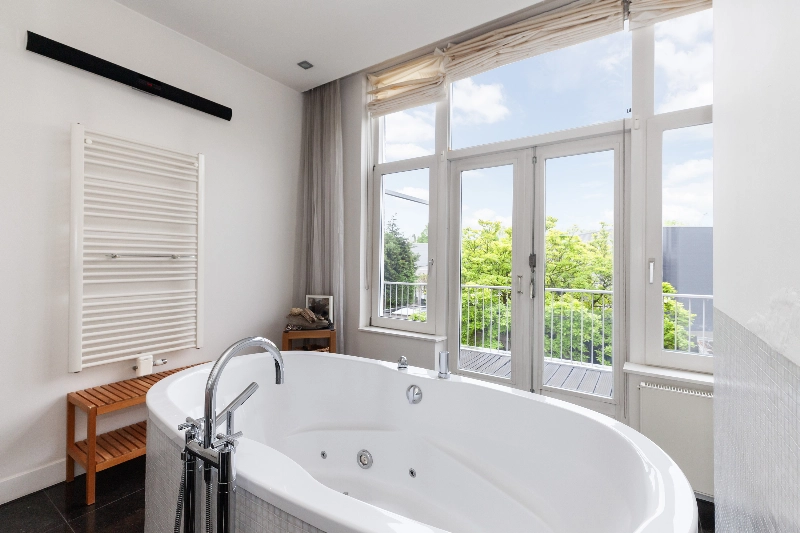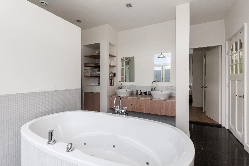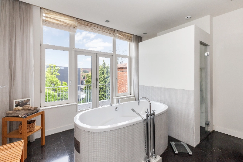 De badkamer is voorzien van stucwerk, een losstaand bad met jets en bubbels, een eiken wastafelmeubel met dubbele waskom, diverse nissen voor uw badkamerspullen en achter de wand is een doorloopdouche met glazen wand. Tevens is er een radiator en de dubbel deur geeft toegang tot het balkon aan de achterzijde.