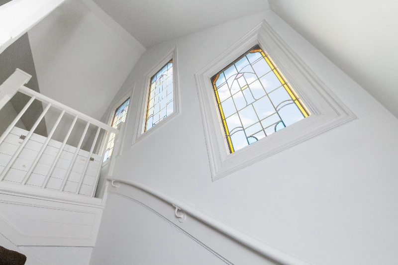 Langs de trap naar de 2e verdieping wordt u getrakteerd op 3 prachtige glas-in-loodramen.