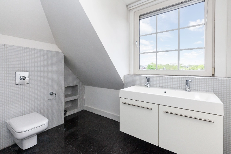 Zeer ruime overloop met een gedeeltelijk wit betegelde toiletruimte met daglicht, zwevend closet en fontein.
