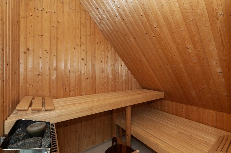 Deze zolder is voorzien van een open ruimte met dakraam, plavuizenvloer, doucheruimte met ingebouwde spots en afzuiging en achter de douche vindt u een grote inpandige berging. In deze kamer is ook een sauna geplaatst.