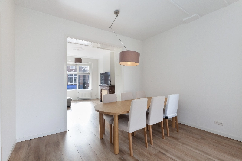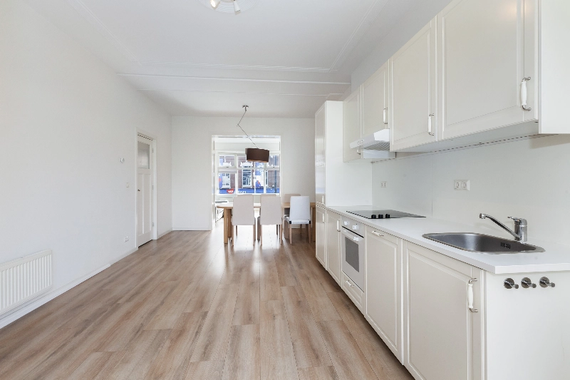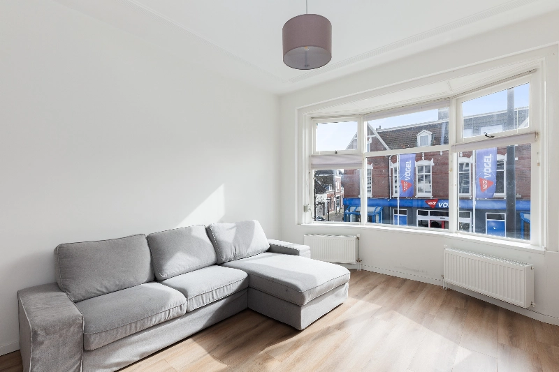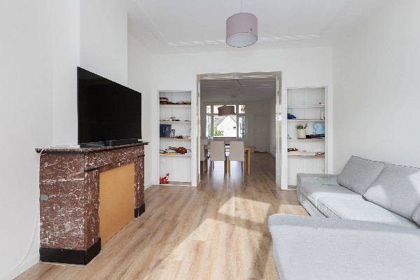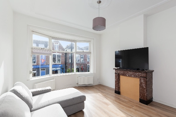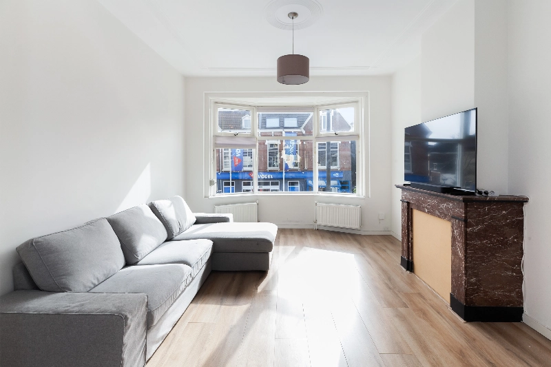 De ruime en lichte woonkamer is gelegen aan de voorzijde van de woning. Vanuit de karakteristieke erker met dubbel glas heeft u uitzicht op de Schiedamseweg. De kamer beschikt over een originele schouw, wat bijdraagt aan de sfeervolle uitstraling.