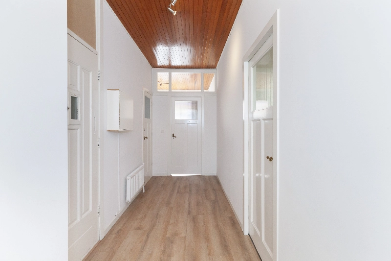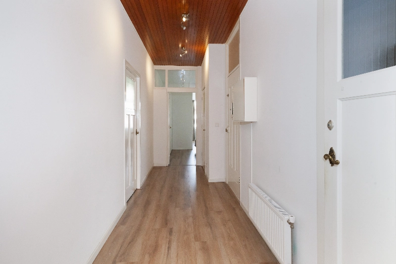 De hal vormt het centrale punt van de woning en geeft toegang tot alle vertrekken. Hier bevindt zich tevens de meterkast met 10 groepen en 3 aardlekschakelaars.