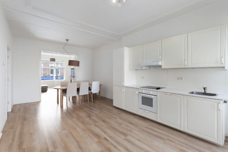 Dit karaktervolle appartement op de eerste verdieping biedt een verrassend ruime indeling met maar liefst ca. 103 m² woonoppervlakte, vijf kamers en een heerlijk privé terras. De woning combineert originele details met comfortabel wonen en beschikt over een royale woonkeuken, twee slaapkamers en een praktische wasruimte.