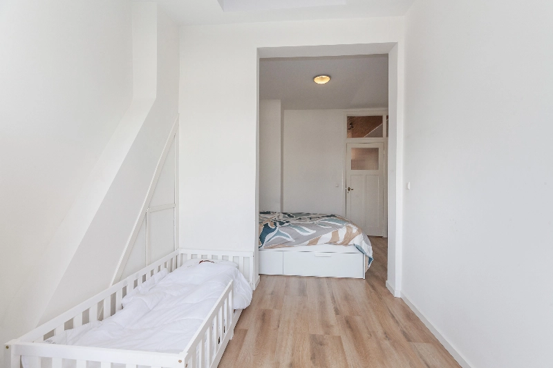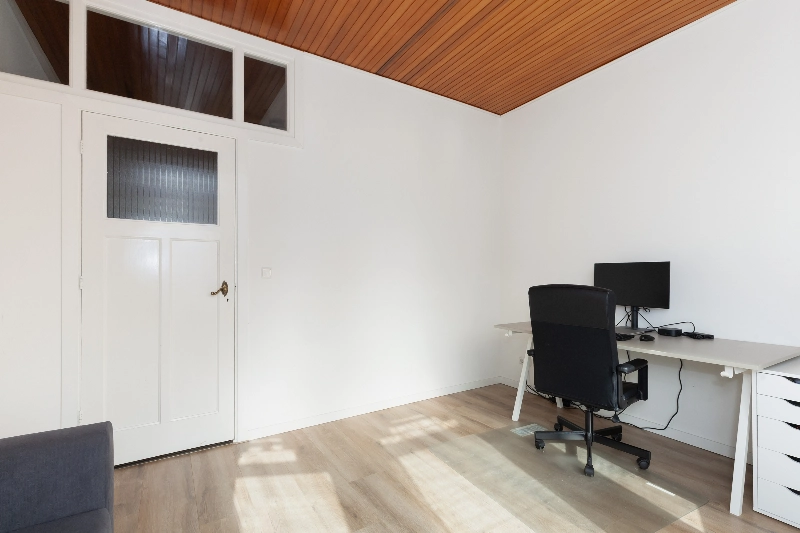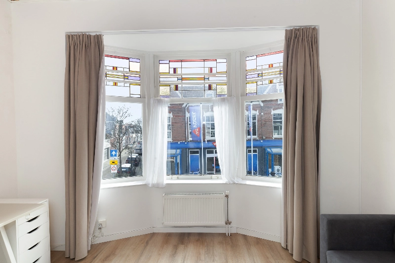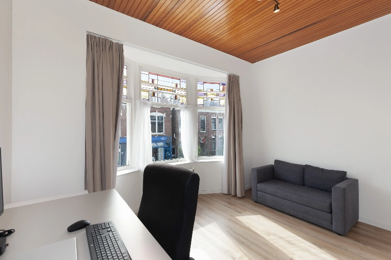 Slaapkamer II bevindt zich aan de voorzijde en wordt momenteel gebruikt als thuiswerkplek. Dankzij de indeling en grootte kan deze ruimte uitstekend dienst doen als slaapkamer. De kamer beschikt over een erker met schuifraam, origineel glas-in-lood en zonwering.