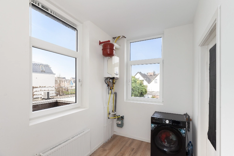 De praktische wasruimte beschikt over aansluitingen voor wasmachine en droger en hier bevindt zich tevens de cv-ketel uit 2017. De ruimte is voorzien van een kunststof kozijn.