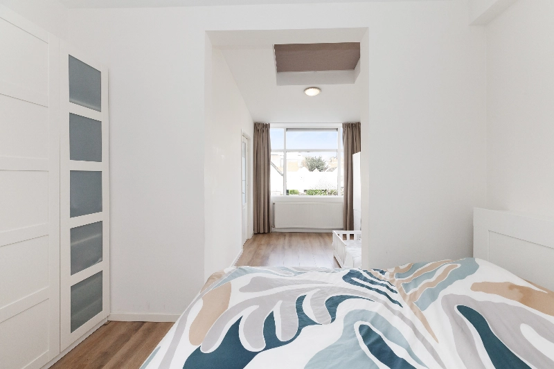 Slaapkamer I ligt aan de achterzijde van de woning en is bereikbaar vanuit zowel de hal als de wasruimte. De kamer heeft een grote raampartij en een ruim daklicht, wat zorgt voor een prettige lichtinval.