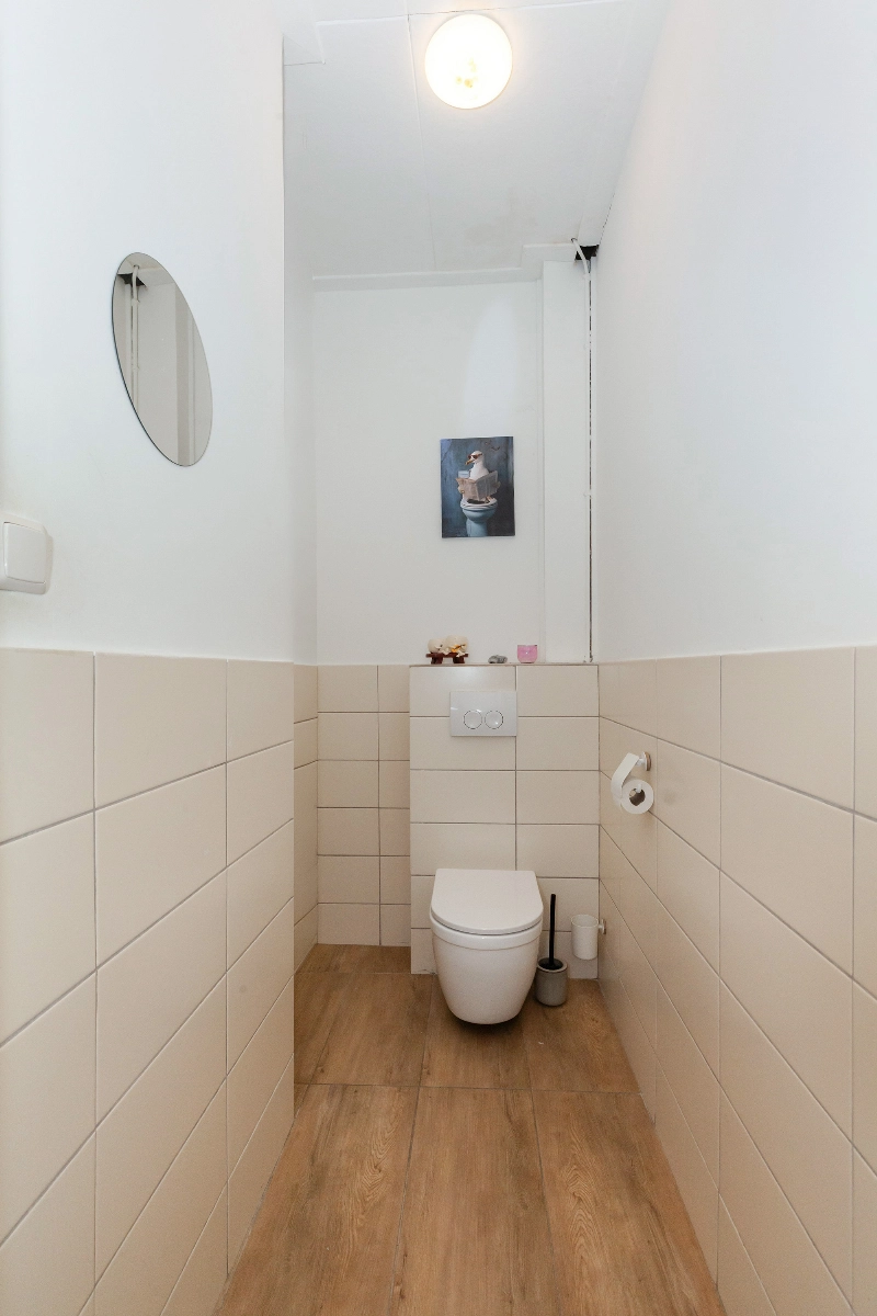 Het toilet is ruim opgezet en half betegeld met crèmekleurige wandtegels. De vloer is afgewerkt met houtlook tegels en het toilet beschikt over een zwevend closet.
