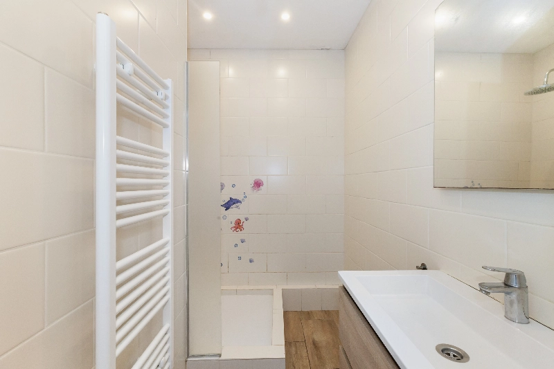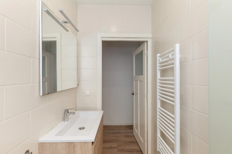 De badkamer is voorzien van een inloopdouche, een wastafelmeubel met spiegel en een handdoekradiator. Het plafond is afgewerkt met inbouwspots en de tegelafwerking sluit aan bij het toilet.