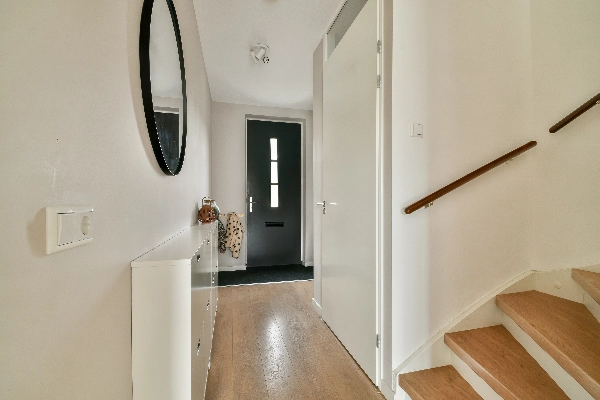 Via de brede stoep en kleine voortuin betreed je de woning. Je komt binnen in de ruime hal met een mooie eikenhouten laminaatvloer welke doorloopt naar de woonkamer en de keuken.
