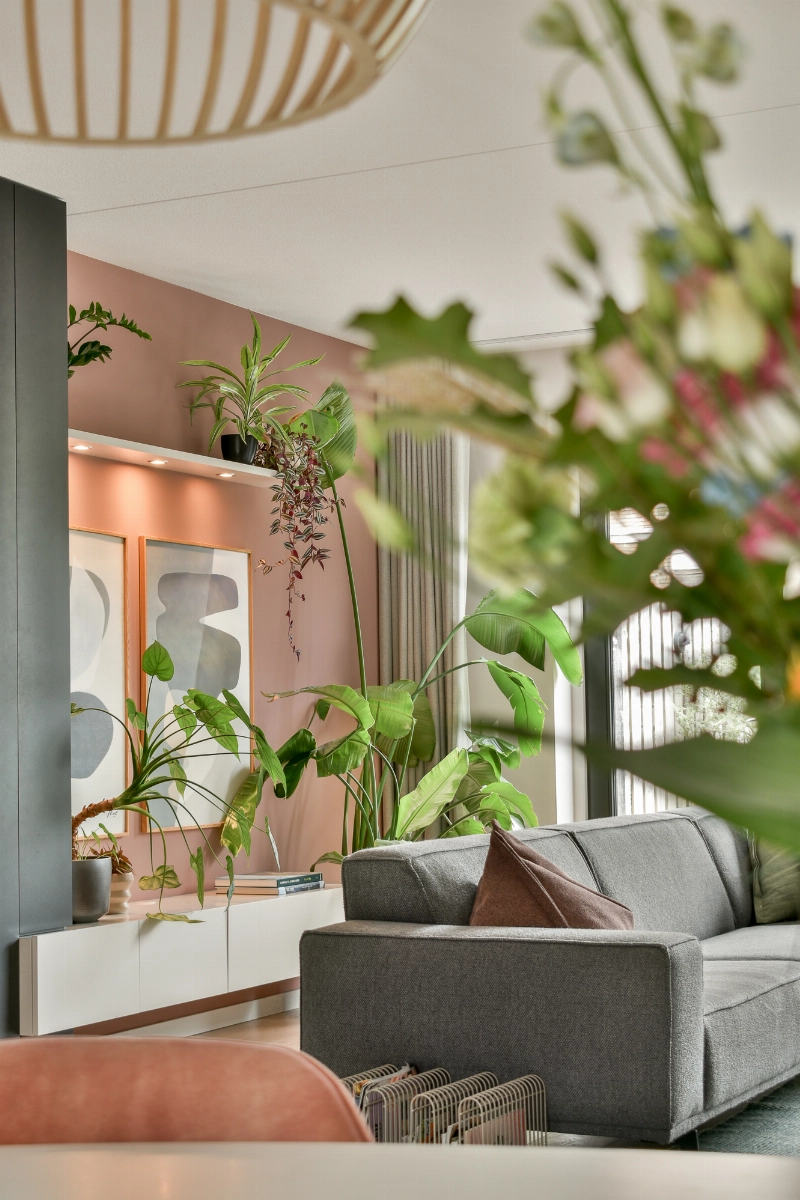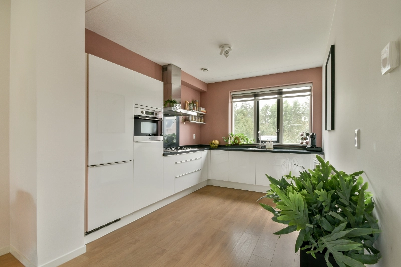 Via de tussendeur kom je in de riante living. De woonkamer is vanuit de bouw voorzien van een uitbouw van 2.4m en vanuit de woonkamer heb je leuk zicht op de achtertuin. Wat een ruimte! Er is een trapkast en de open keuken aan de voorzijde benadrukt de breedte van de woning, deze is namelijk breed van opzet. Deze hoekkeuken is uitgevoerd met een hoge opstelling in hoogglans wit voorzien van een koelkast, vriezer, combi-oven en bergruimte. De lage opstelling is voorzien van een composiet aanrechtblad met kokend- waterkraan, vaatwasser, 5-pits gaskookplaat en een afzuigkap (met afvoer naar buiten). Vanuit de keuken heb je een leuk zicht op het groen en de waterwig.