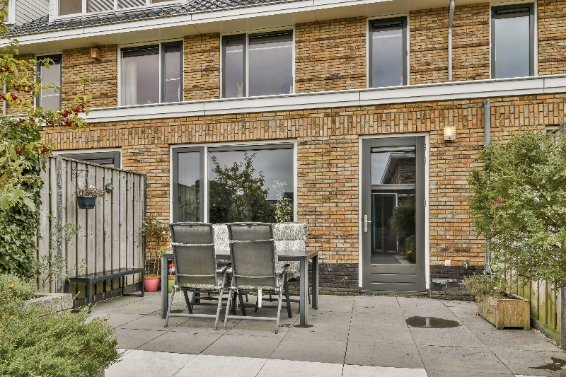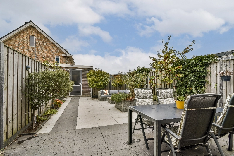 De woning is gelegen op 150m² eigen grond en aan de achterzijde vind je de tuin (noordwest) met houten berging en een poort naar de aangrenzende privé-parkeerplaats. De parkeerplaats sluit aan bij het achterliggende mandelige gebied.