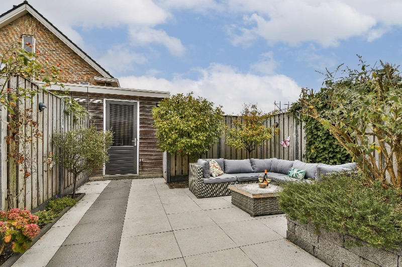 En dan de tuin… Deze is mooi en onderhoudsvriendelijk aangelegd met betegeling, houten schuttingen en veel groen, een waterpunt en een lichtpunt. Achterin de tuin staat een houten berging (met elektra). Naast de berging is ruimte om je auto te parkeren. Door de noordwestligging kan je altijd genieten van de zon én de schaduw tijdens de warme dagen.