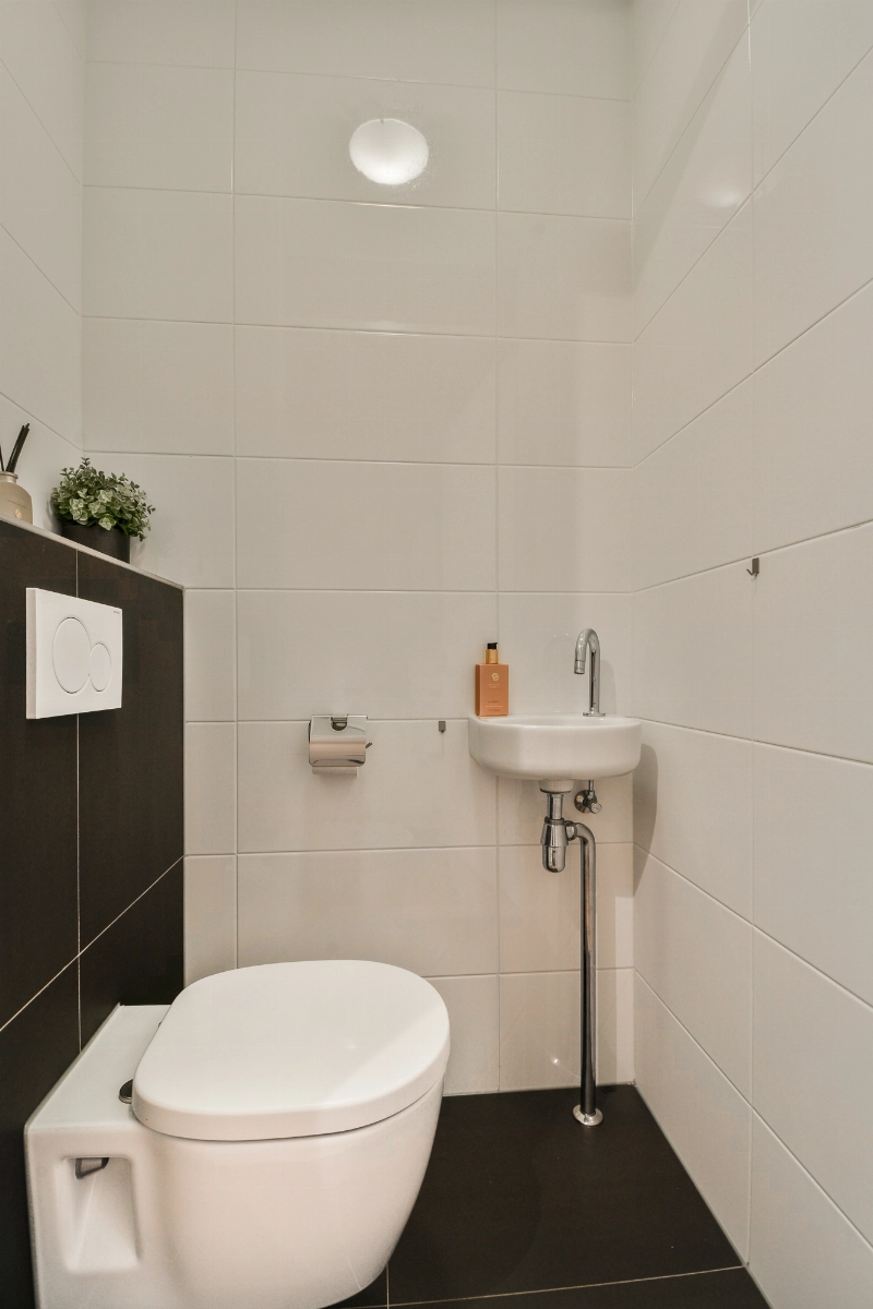 Er is in de hal een meterkast (9 groepen, 3 aardlekschakelaars en een hoofdschakelaar), een garderobenis en een geheel wit/antraciet betegelde toiletruimte met zwevend closet en een fonteintje.