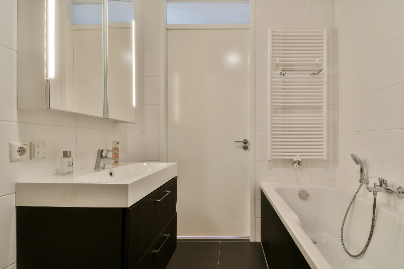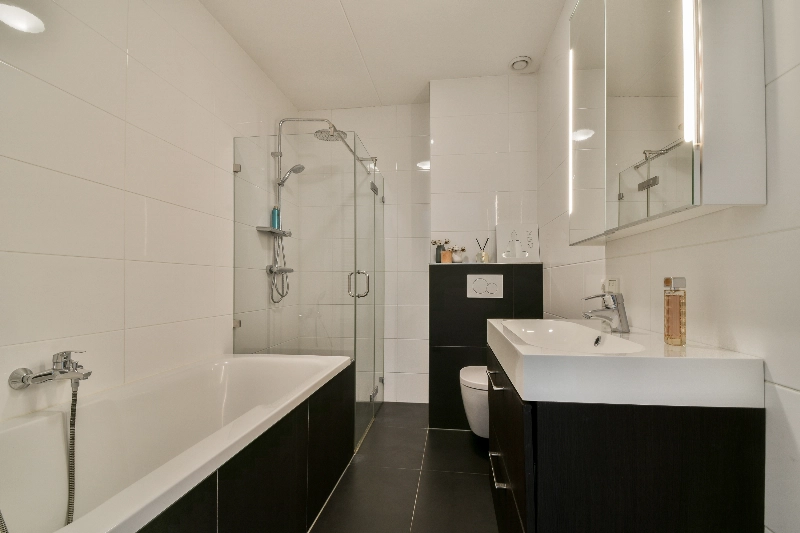 De moderne badkamer is ook weer ruim van opzet en heeft witte- en antracietkleurige betegeling. De badkamer is voorzien van een ligbad, een brede inloopdouche met glazen scherm, een handdoekradiator, een 2e toilet en een breed wastafelmeubel met daarboven een spiegelkast met verlichting.