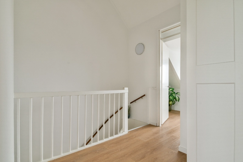 De overloop heeft een hoge nok en er is een vliering gemaakt voor extra bergruimte. Op de overloop vind je de wasruimte met opstelplaats voor de wasmachine en droger en er is een aparte kast voor de CV-ketel en de omvormer van de zonnepanelen.