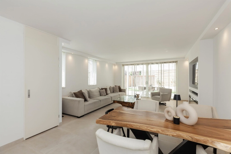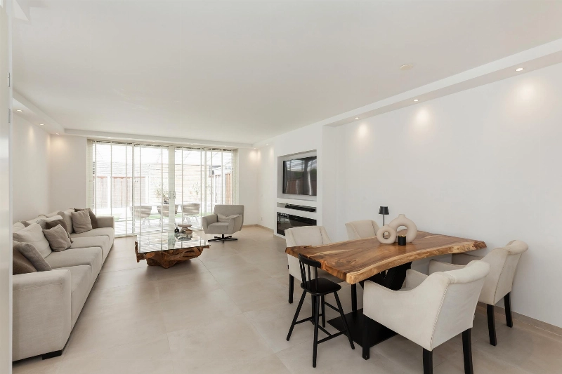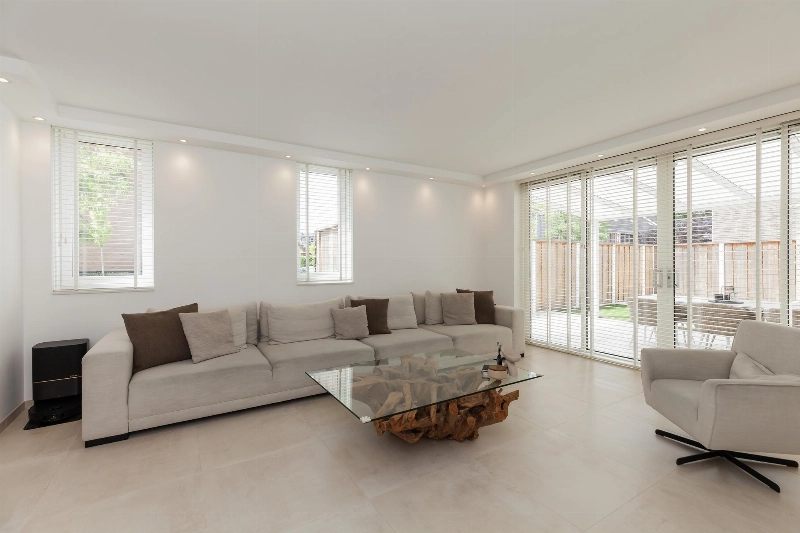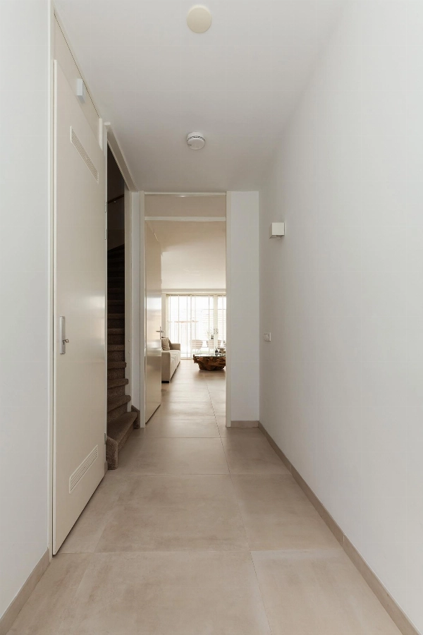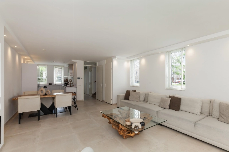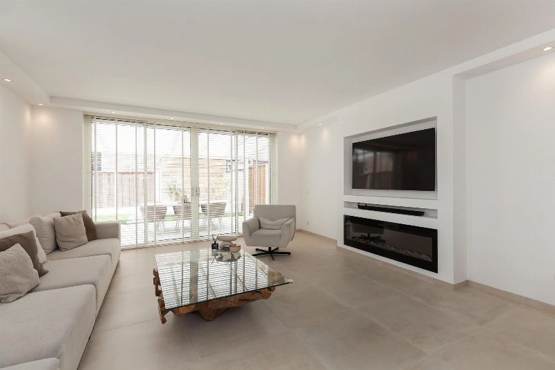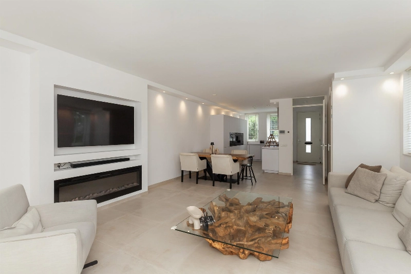 De vloer in de woonkamer is strak afgewerkt met grote, beige plavuizen voorzien van vloerverwarming. De moderne cinemawall met ingebouwde elektrische haard geeft de ruimte extra sfeer. In het plafond zijn spots verwerkt voor een goede verlichting. De kast onder de trap geeft veel extra opbergruimte.