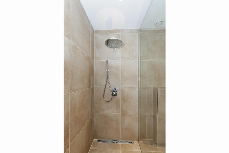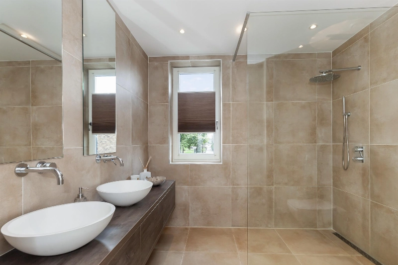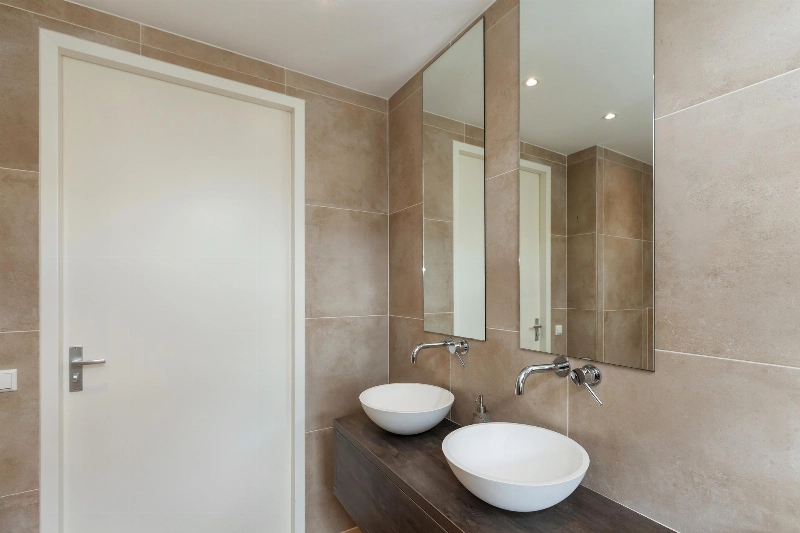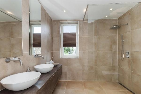 De schitterende luxe badkamer is echt een plaatje! Uitgevoerd met beige/zandkleurige tegels en voorzien van een ruime inloopdouche met een glazen wand, een stortdouche en een handdouche, een zwevend toilet en een dubbele wastafelmeubel met waskommen, lades en twee spiegels.