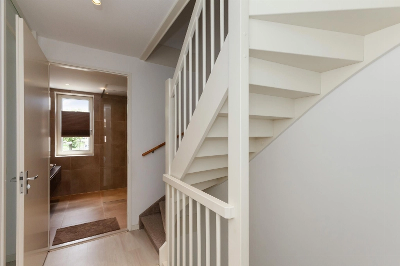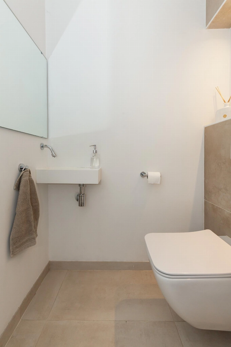 Via de keurig aangelegde voortuin komt u binnen in de ruime en verzorgde hal. De hal heeft een meterkast, een moderne toiletruimte met beige/zand kleurige betegeling, een zwevend closet en een fonteintje.