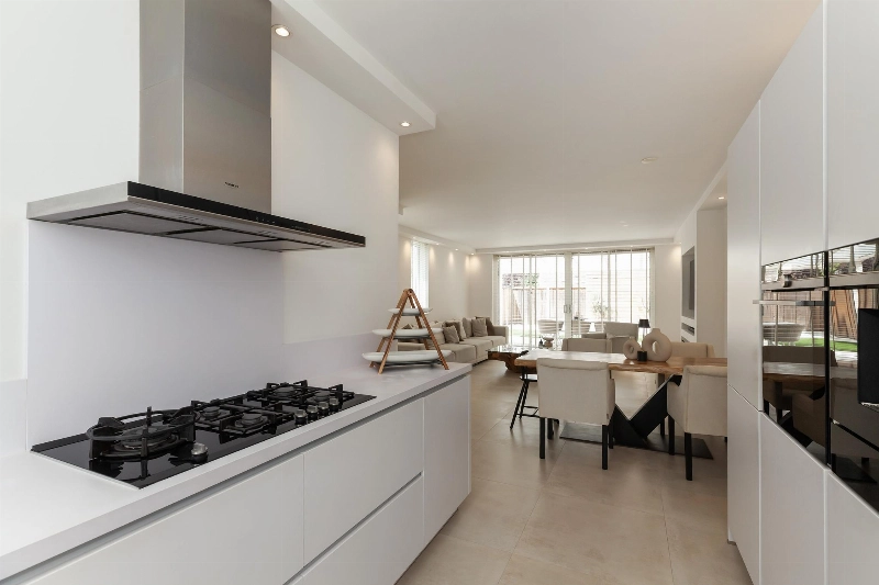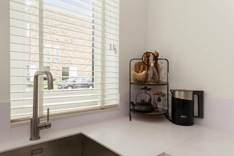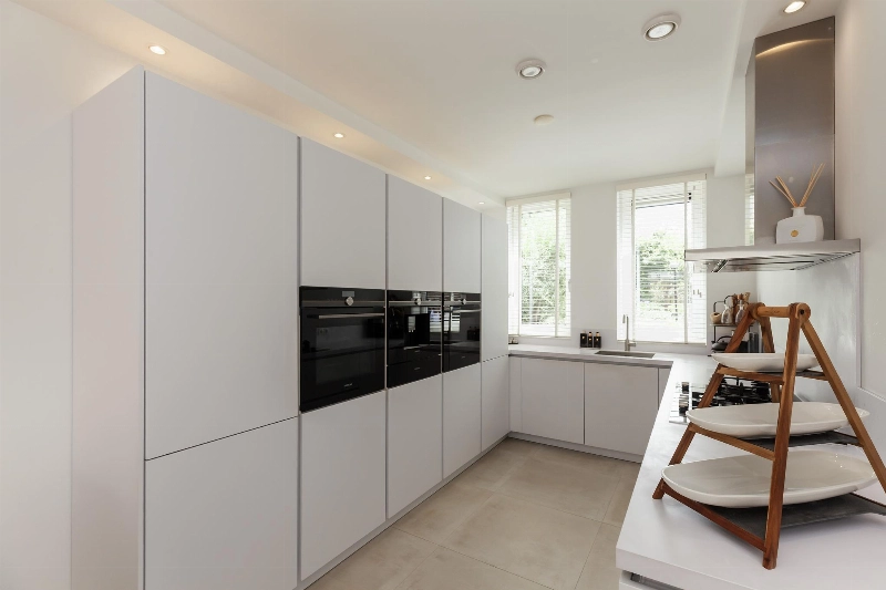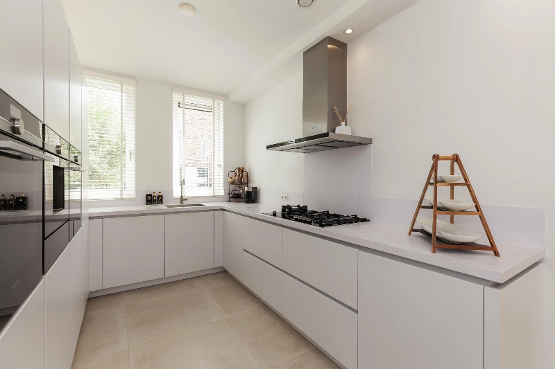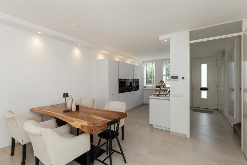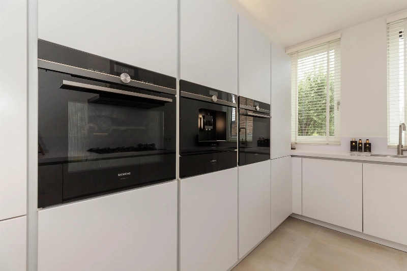 Aan de voorzijde van de woning bevindt zich de luxe, matwitte keuken van het merk Häcker Systemat in een U-opstelling met een kastenwand en volop opbergruimte in de handige lades, kasten met binnenlades en een carrouselkast. Deze keuken is compleet uitgerust met hoogwaardige Siemens-apparatuur: een 5-pits gas op glaskookplaat, een RVS/glazen afzuigkap, een combi-stoomoven, een oven, een ingebouwd koffiezetapparaat, een vaatwasser, een koelkast en een warmhoudlade. Het witte keukenblad is gemaakt van TopCore. Deze is stootvast, watervast, hygiënisch en makkelijk te reinigen.