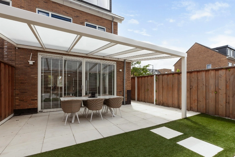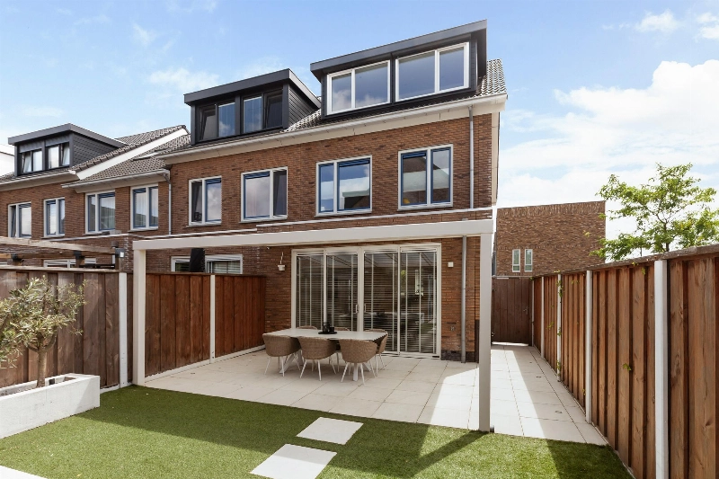 De woonkamer is tijdens de bouw uitgebouwd en daardoor een heerlijk ruim en licht dankzij de zijramen. De grote schuifpui zorgt eveneens voor veel lichtinval en brengt u in de mooi aangelegde tuin. De achtertuin is extra breed door de hoekligging en 9.32 diep en ligt op het noordwesten. De tuin is deels betegeld met lichte tegels, beschikt over een fraaie overkapping met ingebouwde spots, een houten berging met elektra, een buitenkraan en een handige achterom.