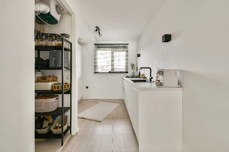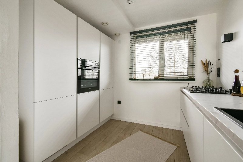 We gaan weer naar binnen en lopen naar de voorzijde. Hier kom je in de open keuken. Deze is in 2020 voorzien van een moderne matwitte opstelling met gemarmerd kunststof werkblad, 4 pits gaskookplaat, brede spoelbak en vaatwasser. De hoge opstelling is voorzien van een koelkast, vriezer en een oven. Tussen de woonkamer en keuken vind je een handige bergkast met opstelplaats voor de CV (welke in 2025 nieuw is geplaatst) en de mechanische ventilatie.