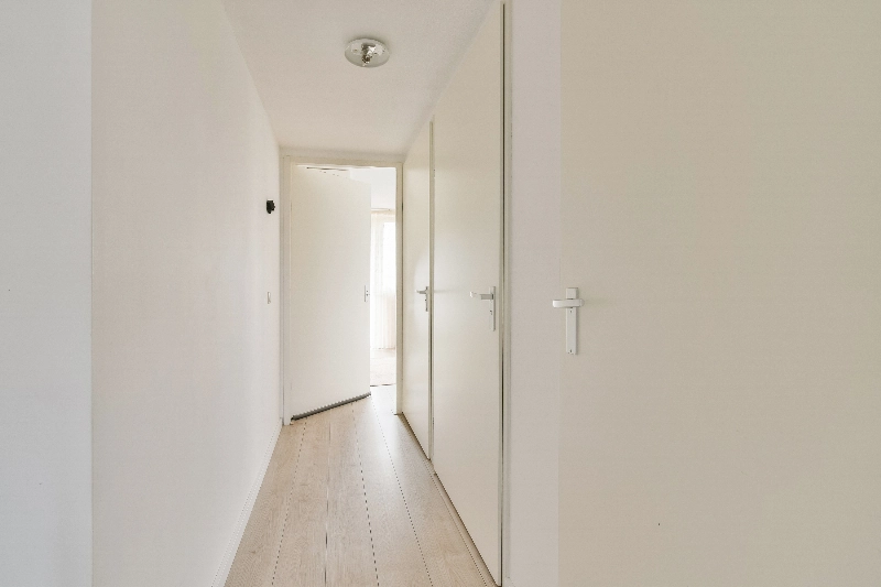 We gaan via de woonkamer door naar een aparte gang met toegang tot de slaapvertrekken en de badkamer, het toilet en de aparte wasruimte.