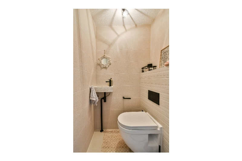 Het toilet (20202) is modern crème betegeld en voorzien van een zwevend closet en een marmeren fontein.