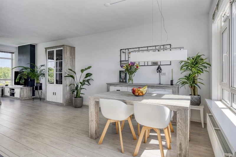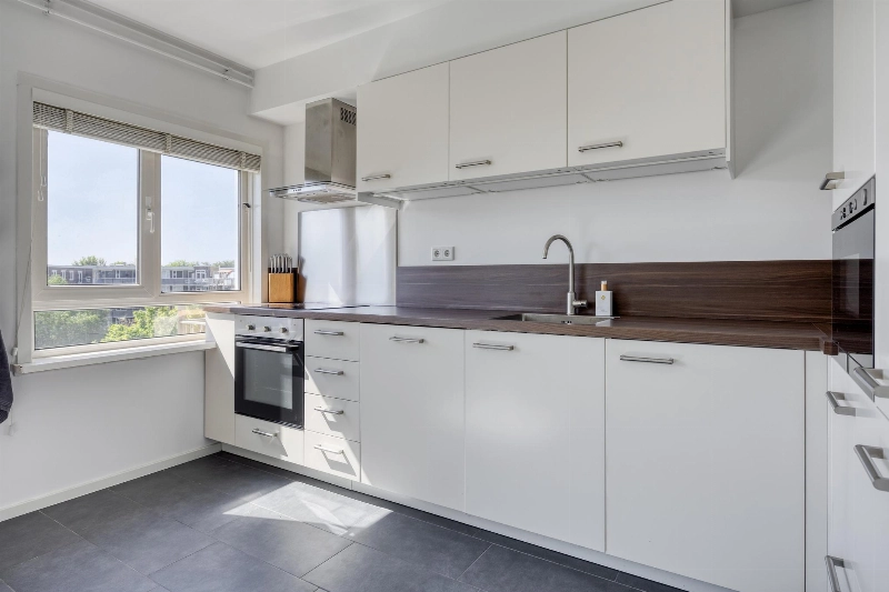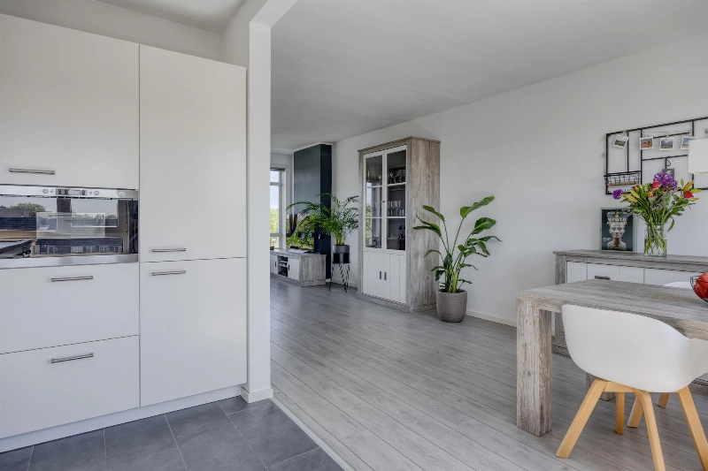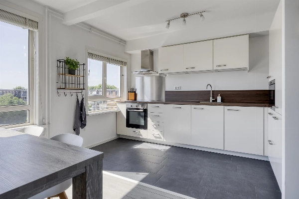 De woonkamer is een prachtige ruime doorzonwoonkamer met grote ramen aan de voor- en achterzijde. Vanuit hier heb je een prachtig uitzicht over de Vlaardingse Vaart en de molen. Om de hoek ligt de moderne keuken welke voorzien is van een plavuizen vloer. De keuken is voorzien van een crèmekleurige hoeksopstelling voorzien van koelkast, vriezer, oven, magnetron, inductie kookplaat, vaatwasser en een afzuigkap met afvoer naar buiten.