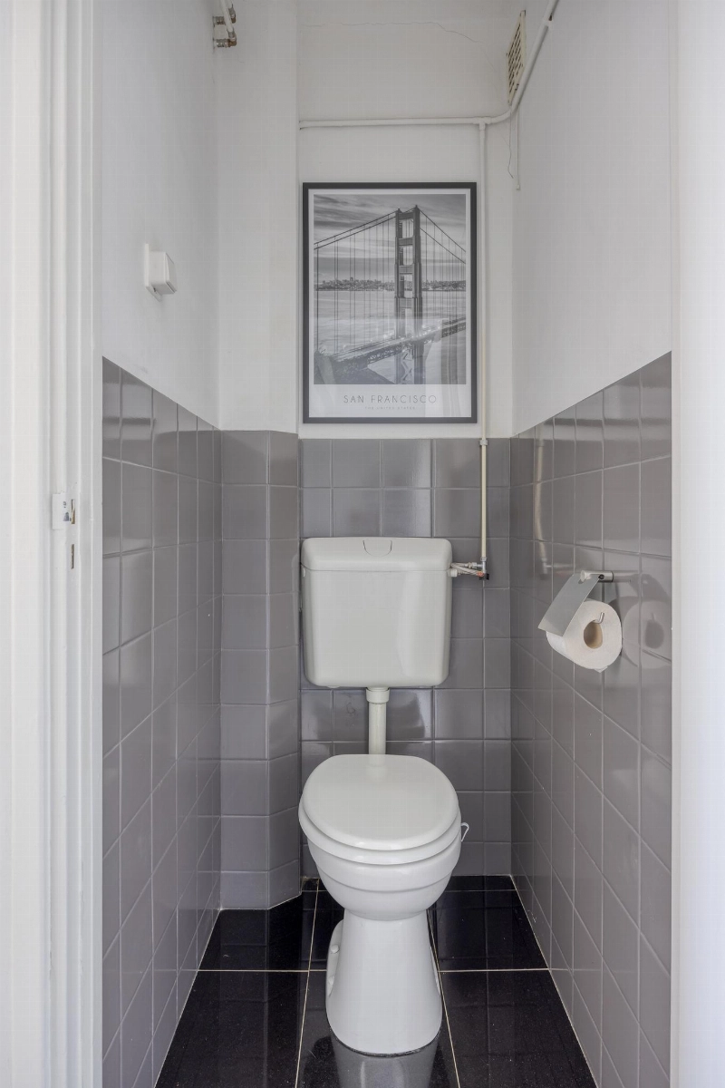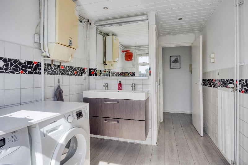 Er is een ruime hal met toegang tot alle vertrekken, een gedeeltelijk betegelde toiletruimte met staand closet en de meterkast. De voormalige keuken bevindt zich aan de achterzijde en is voorzien van breed wastafelmeubel, spiegel, opstelplaats voor de CV en wasmachine/droger. Via de deur bereik je het heerlijk ruime balkon.
