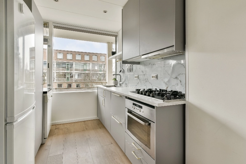 De moderne open keuken, gerenoveerd in 2025, is uitgevoerd met lichtgrijze fronten en een stijlvol marmerlook aanrechtblad. De keuken is uitgerust met een 5 pits gaskookplaat, een vlakschermafzuigkap, een combi-oven en handige opbergruimte.