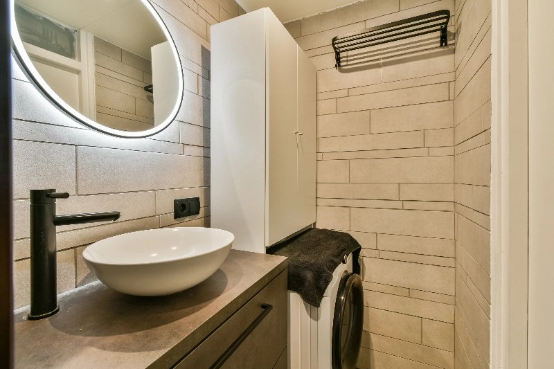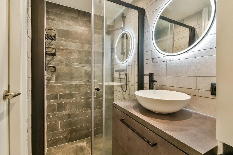 De moderne badkamer (2022) is stijlvol afgewerkt met twee tinten grijze betegeling en voorzien van een aansluiting voor de wasmachine, een ruime douchehoek met een glazen schuifdeur en een modern wastafelmeubel met een waskom, lades en een spiegel met verlichting.