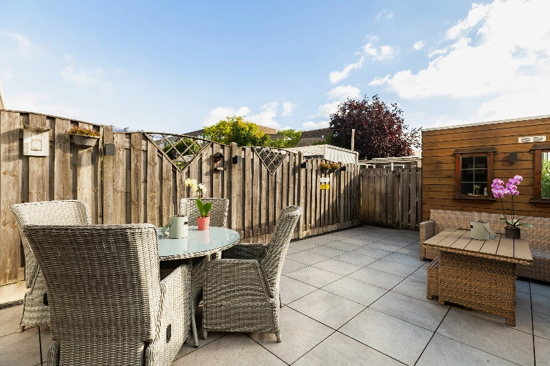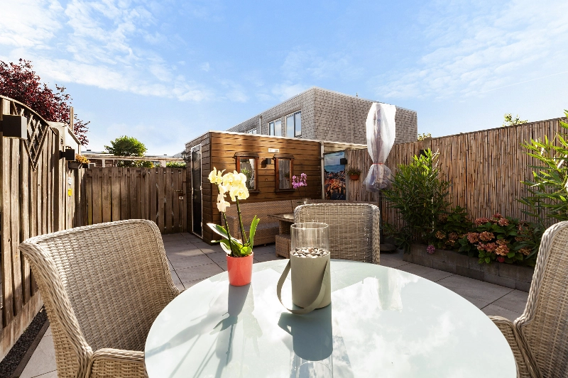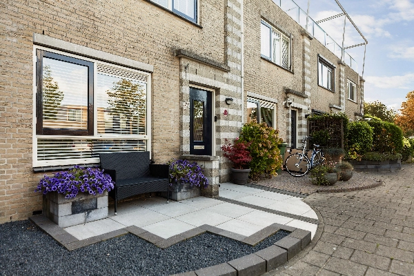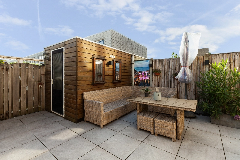 Via de schuifpui stapt u zo de zonnige tuin op het oosten in. Deze is modern en onderhoudsvriendelijk aangelegd met grijze keramische tegels en beschikt over een houten berging met elektra - ideaal voor fietsen of tuingereedschap.