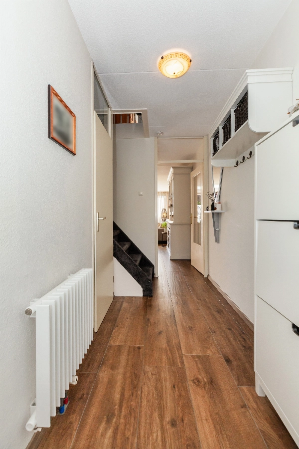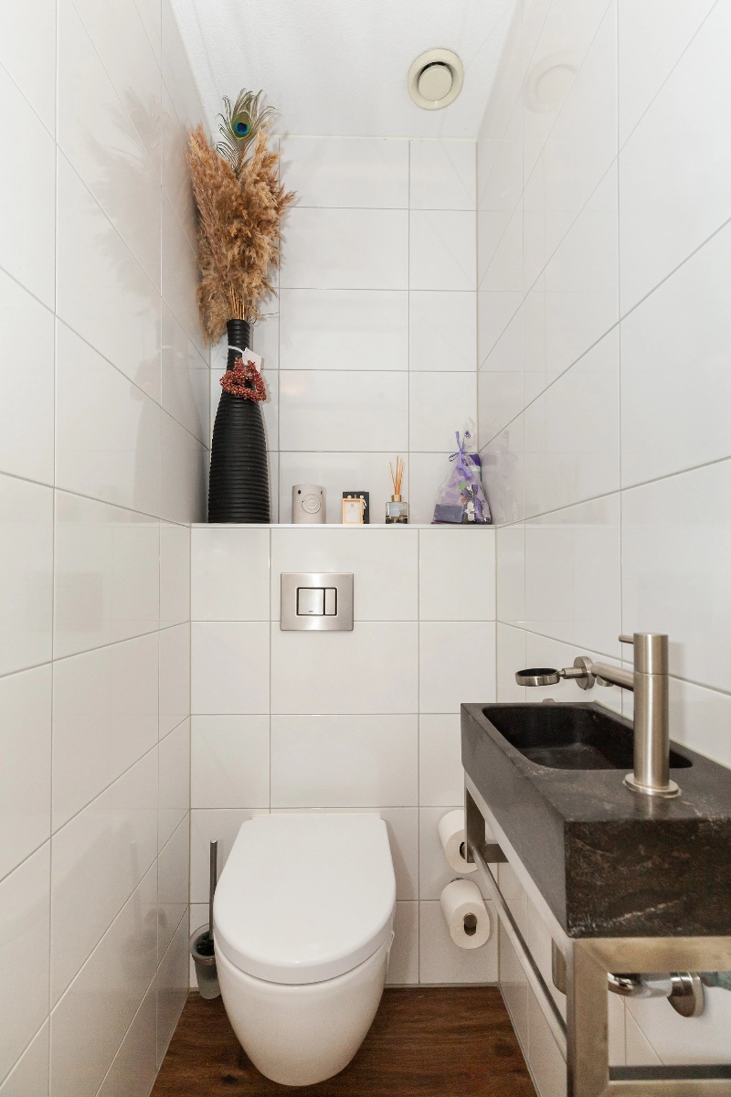 U betreedt de woning via een strak en modern aangelegde voortuin, gelegen aan een groen en gezellig plantsoen. In de hal vindt u de meterkast en een moderne toiletruimte met stijlvolle witte wandbetegeling en een houtlook vloertegel, een zwevend toilet en een fonteintje.